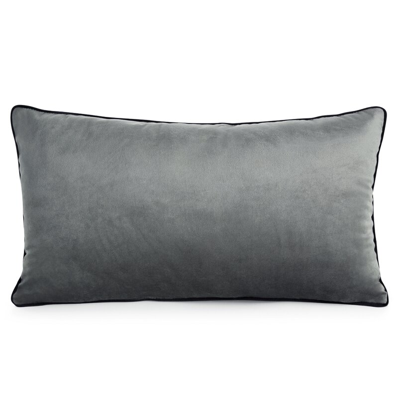Zamatová obliečka na vankúš s výplňou zdobená ozdobným lemovaním. šírka: 30 cm, dĺžka: 50 cm, farba: grafitová, hmotnosť: 220 GSM, zloženie: Materiál: 100% polyester