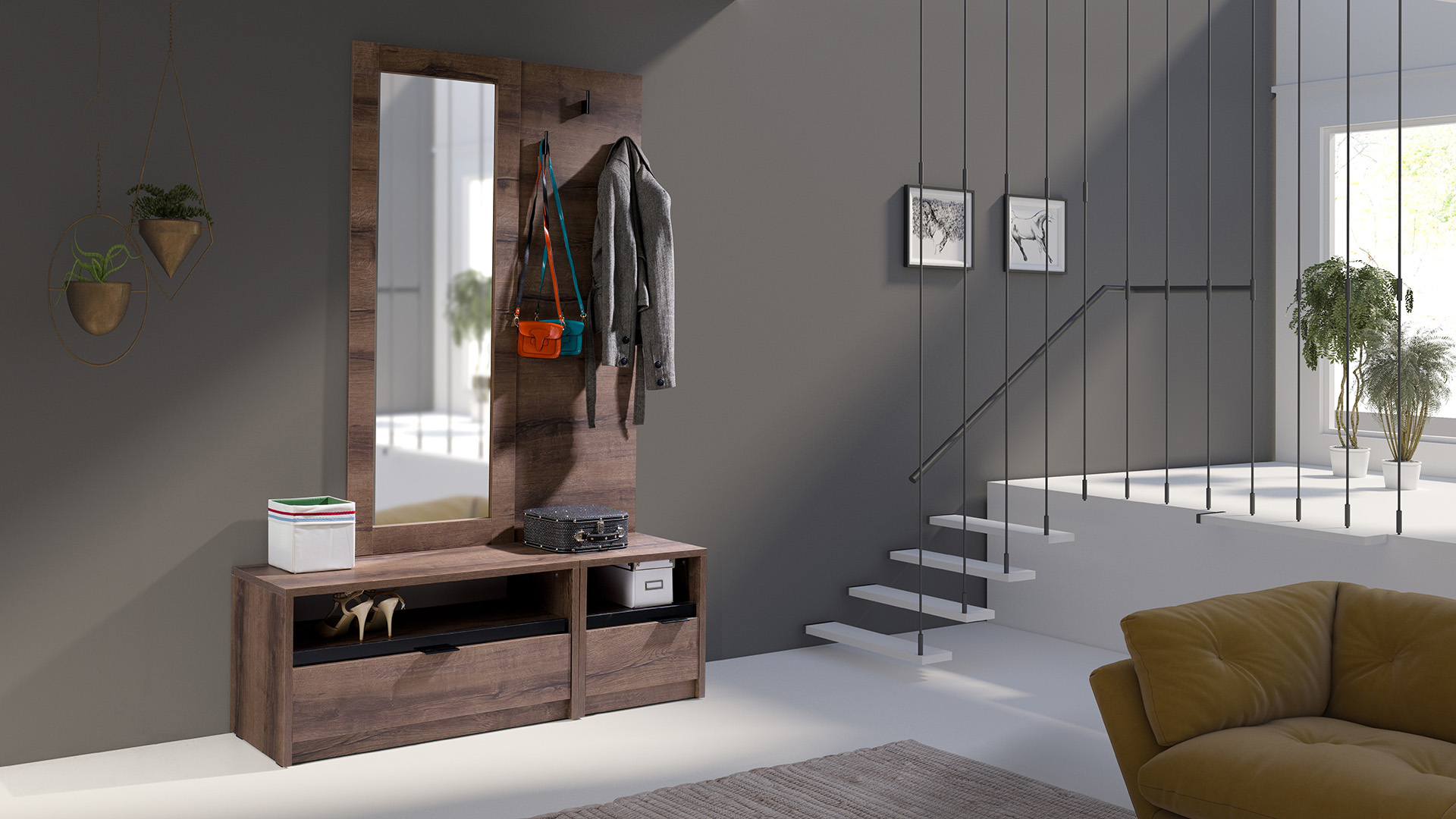 Obľúbená a jedinečná kolekcia DENVER spája v sebe klasický dizajn s modernými a veľmi obľúbenými farbami dubu monastery s doplnkami sivej farby v lesku. Vďaka mnohým elementom si ľahko vyskladáte obývaciu izbu, spálňu, pracovňu či predsieň, ktorú bude obdivovať každý milovník dizajnu. Závesná polica Denver má dve praktické poličky nad sebou, je jednoduchá na zavesenie.