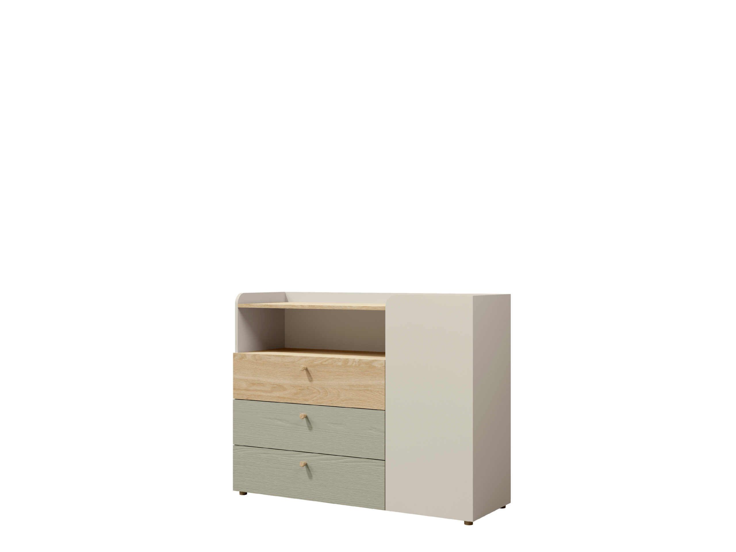 Detská izba by nemala byť len prakticky zariadená, ale mala by tiež vyžarovať príjemnú a osobitú atmosféru. Komoda KULYI 9 v kombinácii sivobéžovej farby, olejovaného duba a eukalyptu prináša ideálny dizajn pre dievčatá aj chlapcov. Táto komoda má jedny dvierka, zásuvky a policu, pričom jej jedinečný vzhľad dopĺňajú minimalistické úchytky v prírodnom odtieni na zásuvkách.