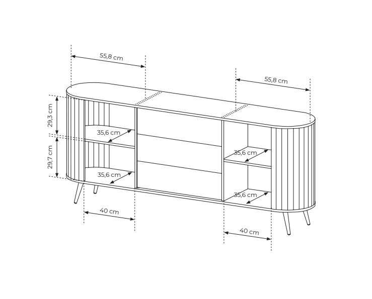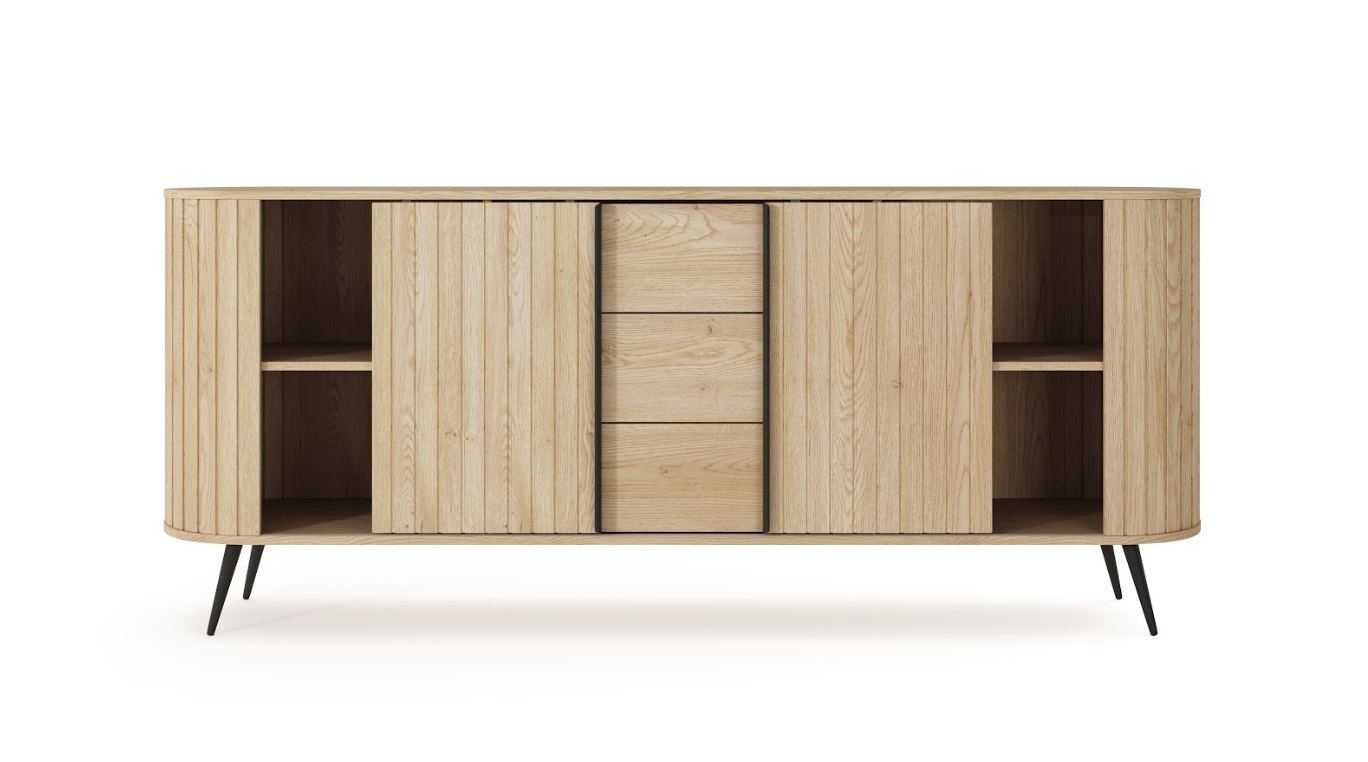 Komoda LOVLI 196 | 2D3S je vyrobená z odolného laminátu s ABS hranami, ktoré zabezpečujú dlhú životnosť a ochranu pred poškodením. Posuvné dvierka s drážkovaným vzorom a zaoblené bočné líšty z MDF vytvárajú charakteristický tvar nábytku. Celkový vzhľad dopĺňajú kvalitné kovové nohy a úchytky. Údržba je rýchla a jednoduchá na čistenie stačí použiť navlhčenú handričku alebo vhodný čistiaci prostriedok na nábytok.