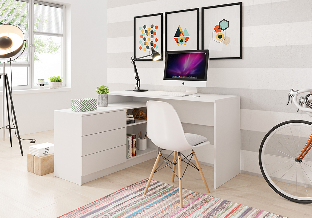 Moderný písací stolík TEODOR je praktický a má mnoho úložného priestoru – priestrannú skrinku a k dispozícii sú tri zásuvky a dva otvorené výklenky. Stôl sa vďaka svojmu originálnemu štýlu hodí nielen do detskej či študentskej izby, ale aj do kancelárie či domácej pracovne. Výhodou stola je jeho univerzálne umiestnenie. To znamená, že si môžete vybrať, na ktorú stranu skrinku namontujete, a tak vytvoriť roh na pravej alebo ľavej strane. Zásuvky sa otvárajú pomocou funkcie push-to-open.