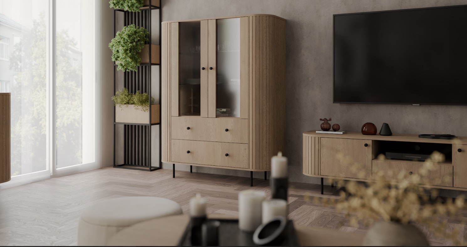 Kolekcia VAOLIA predstavuje minimalistický štýl, ktorý oživujú precízne frézované detaily a originálne zaoblené boky, ktoré vnášajú do interiéru nový rozmer elegancie. Farebné prevedenie sa nesie v tlmených, zemitejších odtieňoch, ako je dub cremona s kombináciou čiernych doplnkov, ktoré decentne narúšajú svetlé tóny. TV stolík VAOLIA 2F1S je dvojdverový s poličkou a zásuvkou. Taktiež má stolík praktický otvor na káble. Jednoduché kovové nohy a úchytky, dostupné v prevedení čiernom dodávajú tv stolíku ľahkosť a vzdušnosť bez toho, aby ho opticky zaťažili.