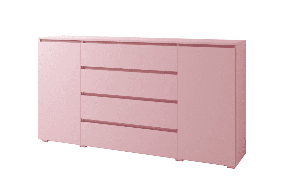 Komoda COSMO C06 je moderná a elegantná komoda vhodná do dievčenskej izby. Zaujímavé ružové farebné prevedenie podporí atraktívny vzhľad nábytku. Bezúchytový systém je veľmi praktický a bezpečný, ale zároveň aj dizajnovo očarujúci. Komoda má 4 zásuvky a 2 dvierka, za ktorými je na každej strane 1 polica.