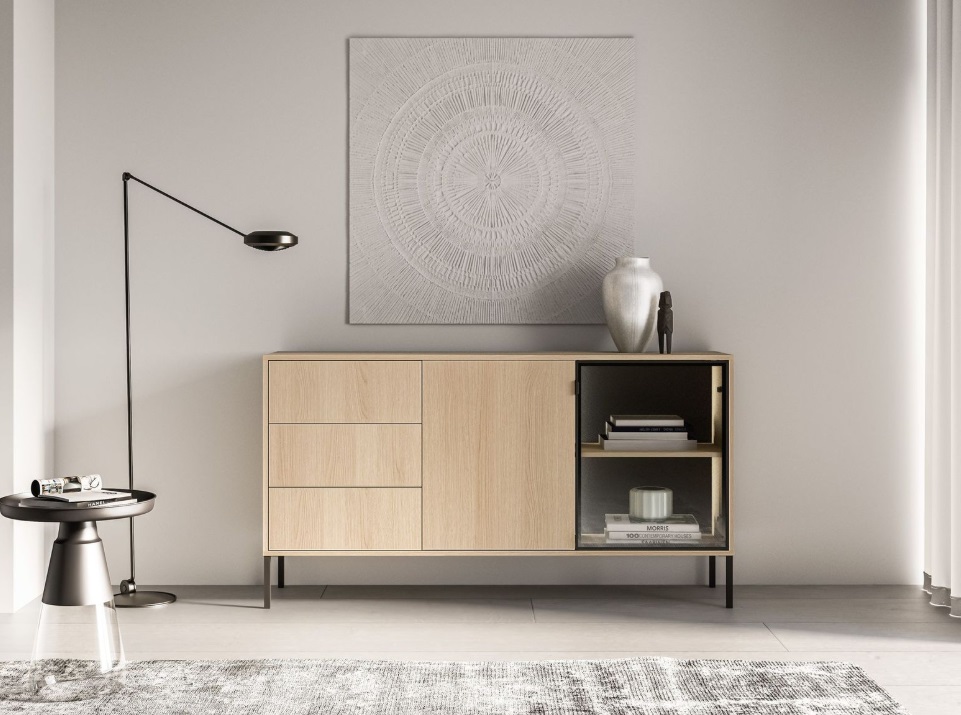 Komoda ABEREN 02 vo farebnom prevedení dub lindberg prináša moderný nábytok s čistými líniami, elegantnými detailmi a praktickými riešeniami. Kombinácia hliníkového rámu v čiernej farbe s tvrdeným sklom, kovových prvkov a jemného LED podsvietenia vytvára sofistikovaný vzhľad, ktorý dodá obývačke či spálni jedinečnú atmosféru. Ideálna voľba pre tých, ktorí hľadajú štýl, funkčnosť a nadčasový dizajn v jednom. Komoda je priestranná so zásuvkami a vysokými nohami, ktoré sú vhodné pre robotický vysávač.