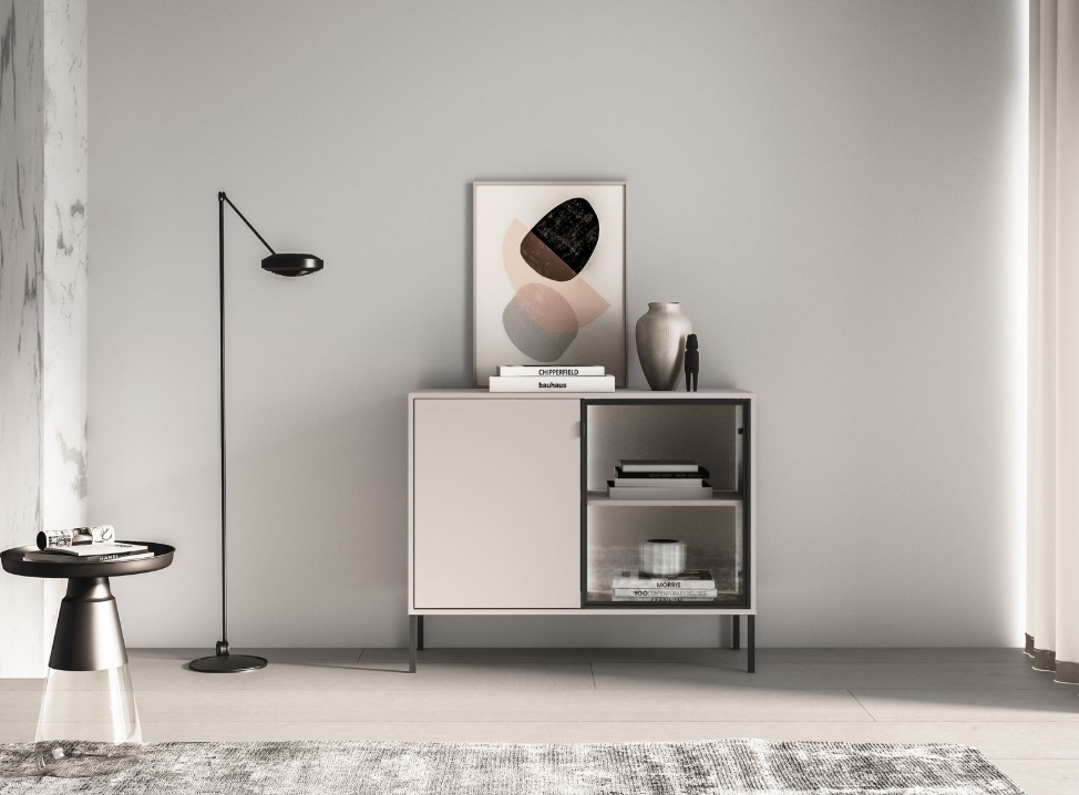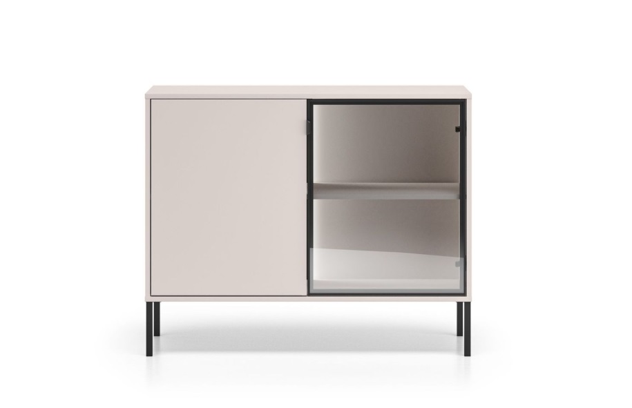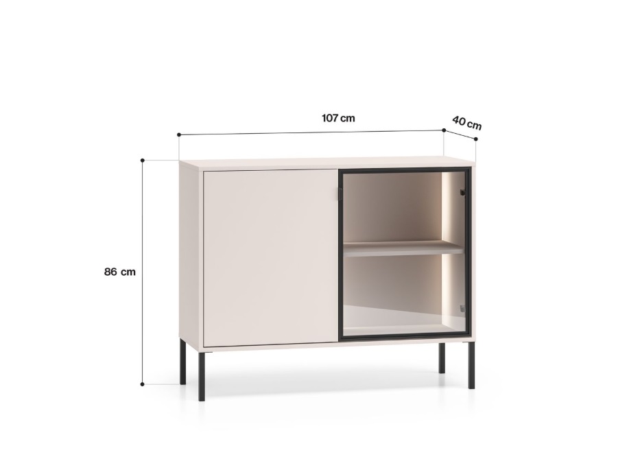 Komoda ABEREN 03 vo farebnom prevedení cashmere prináša moderný nábytok s čistými líniami, elegantnými detailmi a praktickými riešeniami. Kombinácia hliníkového rámu v čiernej farbe s tvrdeným sklom, kovových prvkov a jemného LED podsvietenia vytvára sofistikovaný vzhľad, ktorý dodá obývačke či spálni jedinečnú atmosféru. Ideálna voľba pre tých, ktorí hľadajú štýl, funkčnosť a nadčasový dizajn v jednom. Komoda je priestranná dvojdverová s vysokými nohami, ktoré sú vhodné pre robotický vysávač.