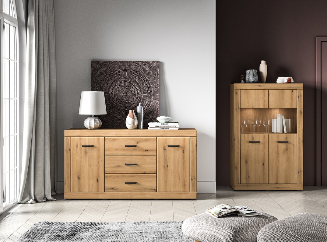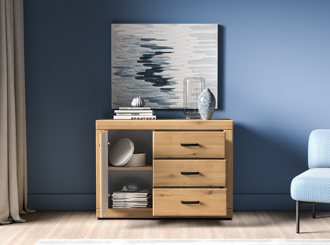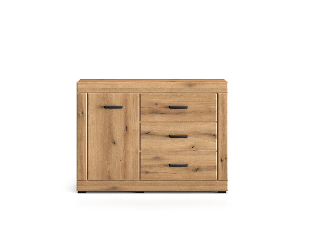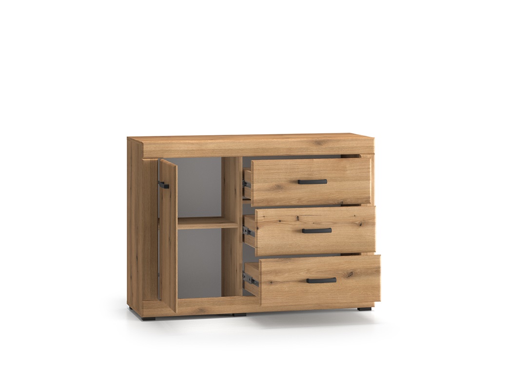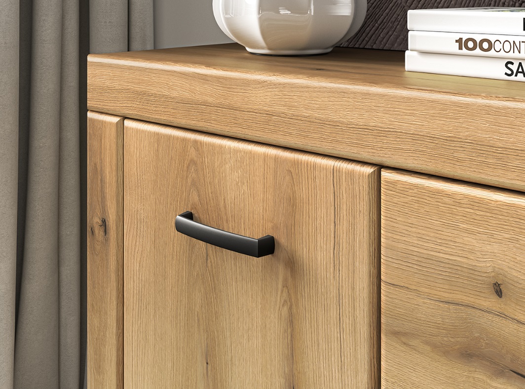 Kolekcia DARIA je stvorená pre tých, ktorí hľadajú štýlovú obývačku s nádychom elegancie a pohody. Jemne zaoblené línie komody DARIA 05, prírodný dekor Evoke Oak a decentné detaily v čiernej farbe vytvárajú harmonický celok, ktorý pôsobí moderne a zároveň útulne. Kombinácia kvalitného spracovania a premyslených detailov prináša nielen krásu, ale aj komfort do každodenného života. Komoda ponúka praktické zásuvky, s jednými dvierkami a jednou vnútornou policou.