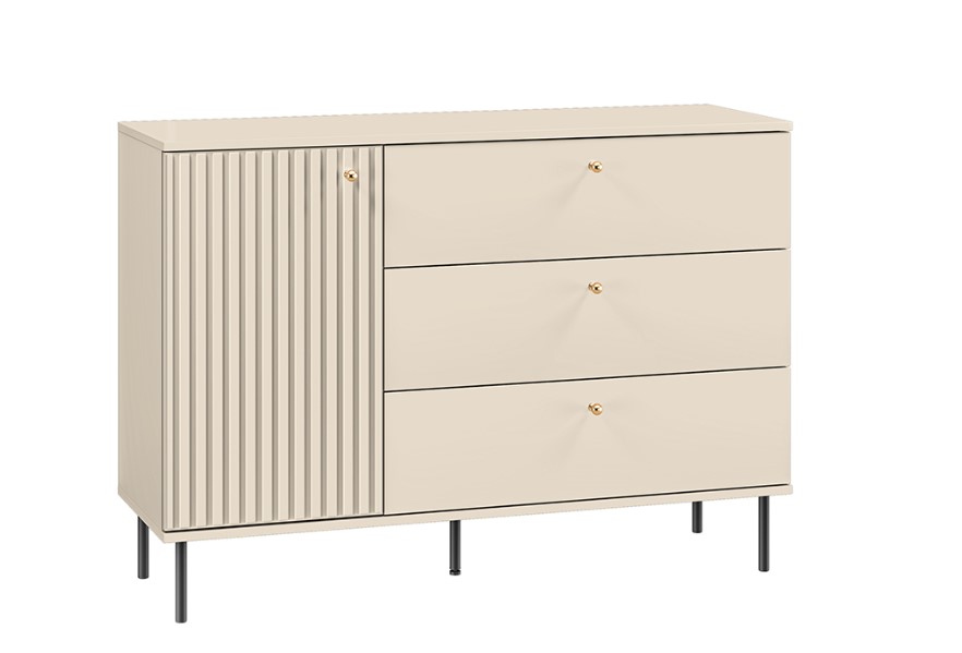 Dvojdielnu komodu OLIVIA 05 na vysokých nohách v trendy farbe kašmír oživujú vrúbky na dvierkach. Zvislé vrúbky zdôrazňujú eleganciu a charakter komody, dodávajú priestoru textúru a hmatateľnosť, čo vytvára zaujímavý vizuálny kontrast s hladkými povrchmi. Komoda OLIVIA 05 má jedny dvierka a tri zásuvky. Oceníte tiché zatváranie dvierok, plný výsuv zásuviek a ABS hrany. Doprajte si útulný priestor, kde sa budete cítiť pohodlne a doma.
