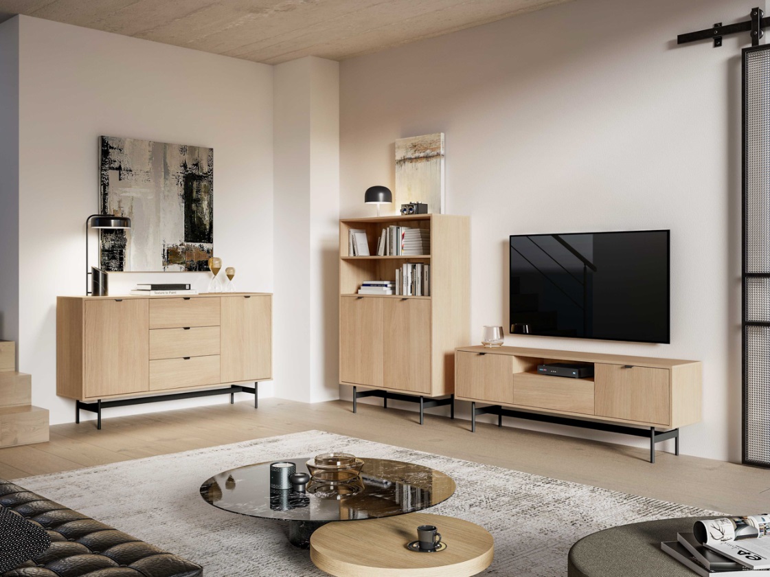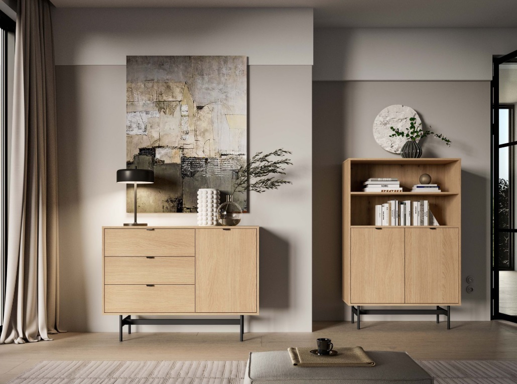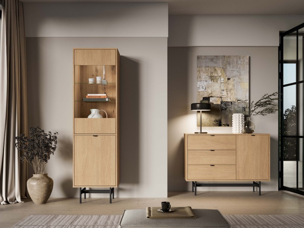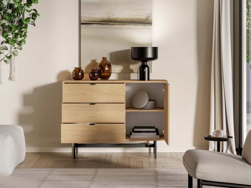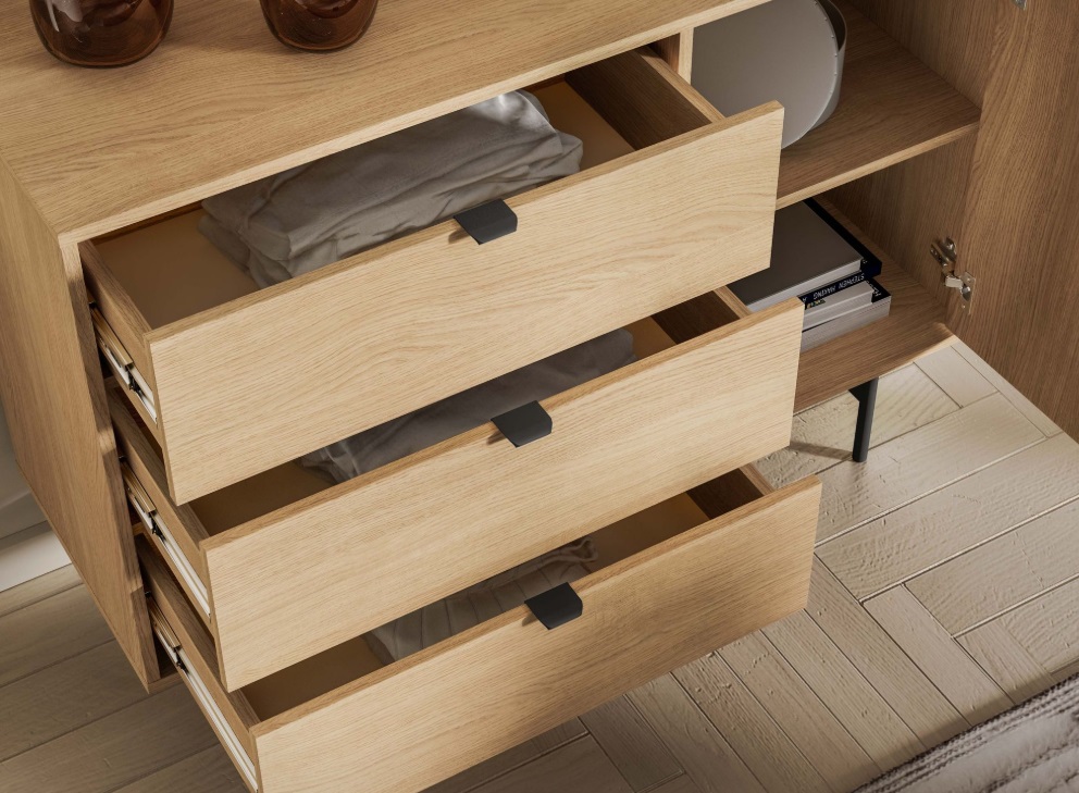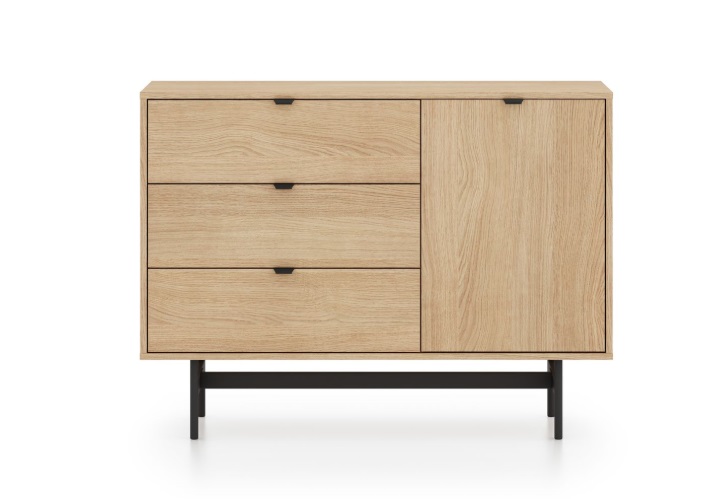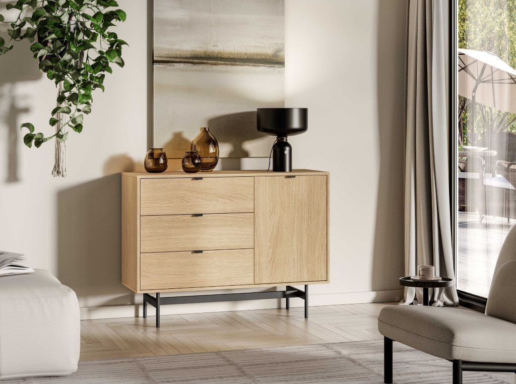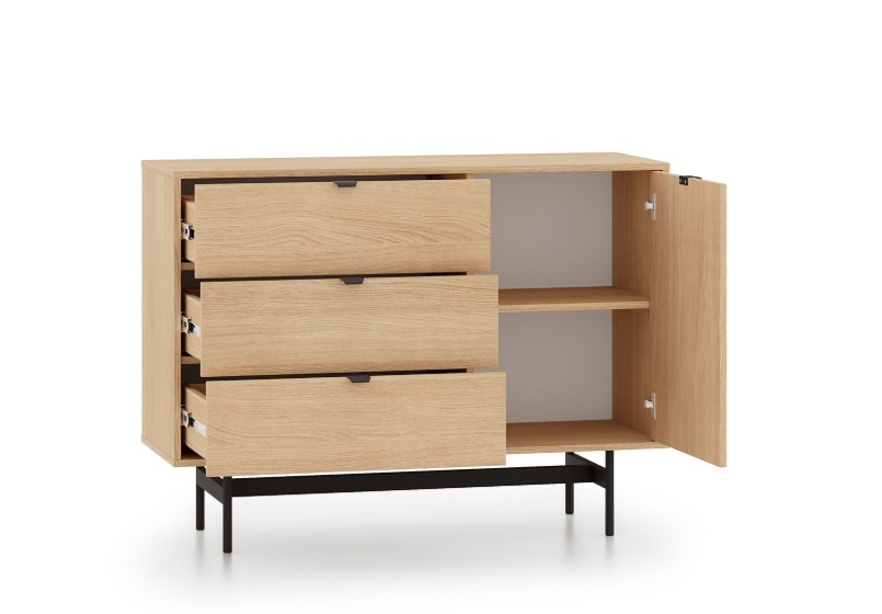 Komoda SORENY 04 je navrhnutá pre moderné interiéry, v ktorých sa spája elegantný dizajn, jednoduchosť a funkčnosť. Dekor dub Mavelie Natural prináša do priestoru prirodzený a teplý vzhľad, zatiaľ čo minimalistická forma dodáva nábytku nadčasový charakter. Nábytok je postavený na ľahkej kovovej konštrukcii, ktorá mu dodáva vzdušnosť a moderný vzhľad. Praktickosť nábytku zvyšujú funkčné riešenia, ako sú plnovýsuvné zásuvky, systém push-to-open a pánty s tichým dovieraním, ktoré zabezpečujú pohodlné a tiché používanie. Komoda je určená na zariadenie obývacej izby aj spálne, vďaka čomu umožňuje vytvoriť jednotný a harmonický interiér v celom byte.