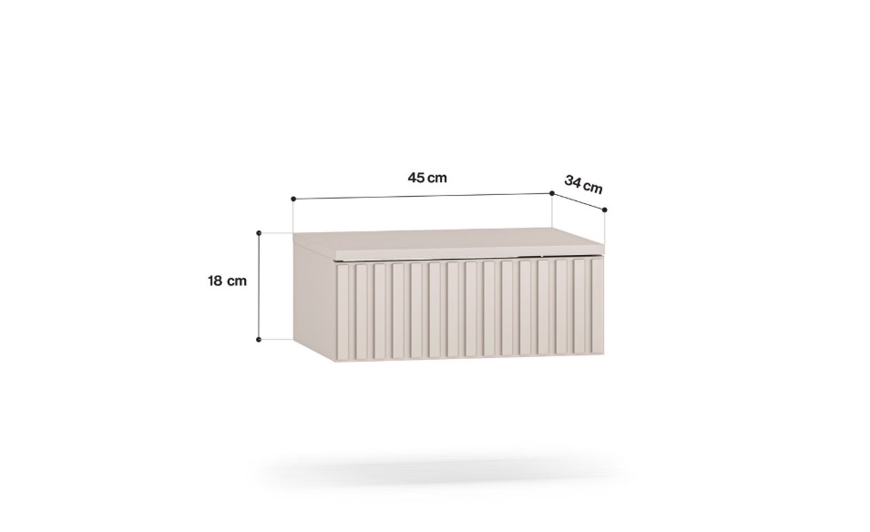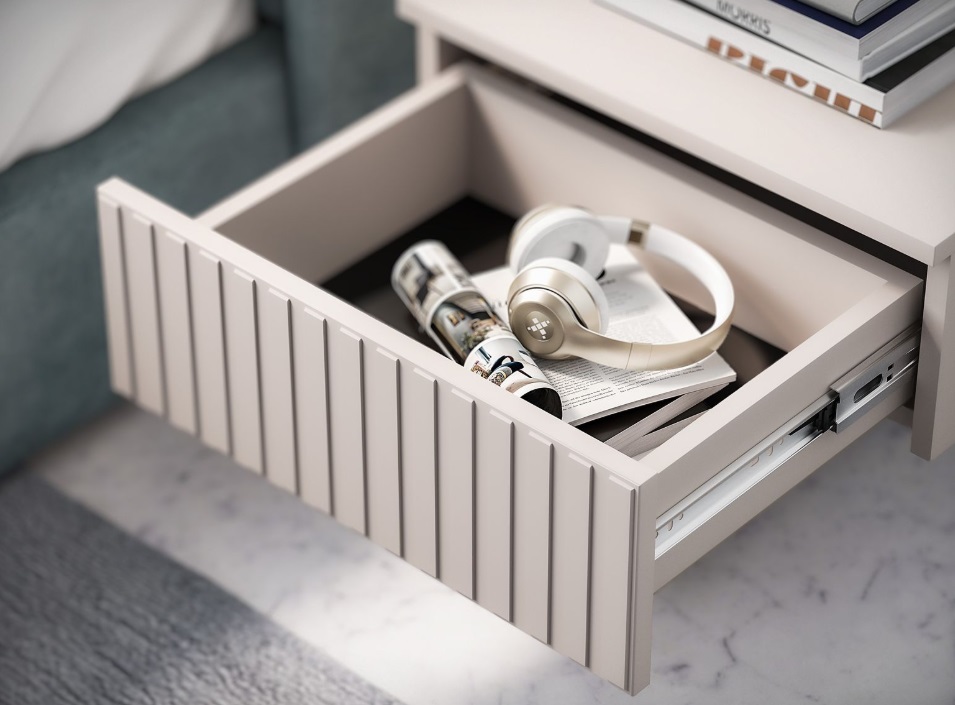 Moderný nočný stolík OLIVIA 29 na vysokých nohách v trendy farbe kašmír oživujú vrúbky na dvierkach. Zvislé vrúbky zdôrazňujú eleganciu a charakter nočného stolíka, dodávajú priestoru textúru a hmatateľnosť, čo vytvára zaujímavý vizuálny kontrast s hladkými povrchmi. Nočný stolík OLIVIA 29 má otvorenú policu a jednu zásuvku. Oceníte ABS hrany. Doprajte si útulný priestor, kde sa budete cítiť pohodlne a doma.