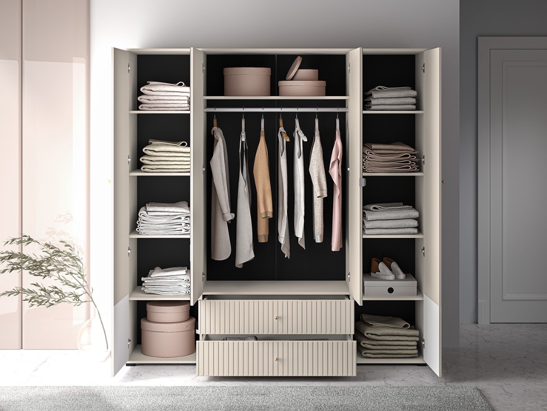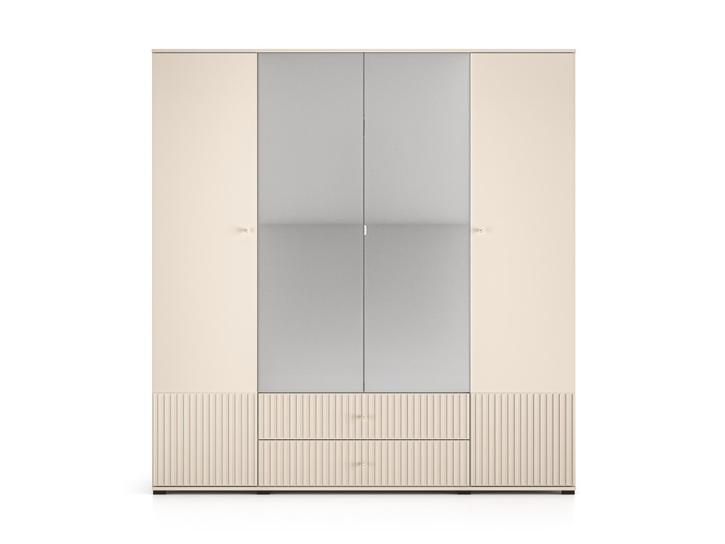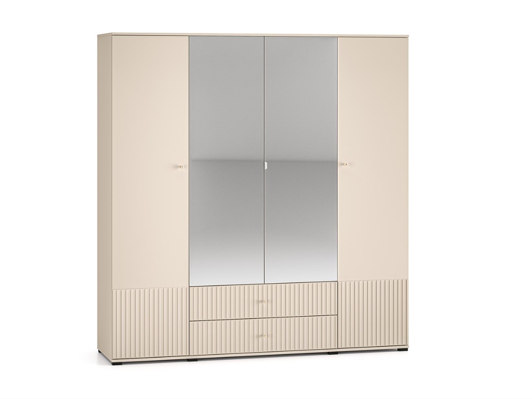 Dokonalá šatníková skriňa OLIVIA 23 má praktické vysoké nohy v čiernej farbe. Skriňa je v trendy farbe kašmír, je ozdobená vrúbkami na spodnej časti dvierok. Zvislé vrúbky zdôrazňujú eleganciu a charakter skrine, dodávajú priestoru textúru a hmatateľnosť, čím vytvárajú zaujímavý vizuálny kontrast s hladkými povrchmi. Šatníková skriňa OLIVIA je štvordverová so zásuvkami, policami a vešiakovou tyčou. Nechajte sa inšpirovať našou peknou a modernou ponukou.