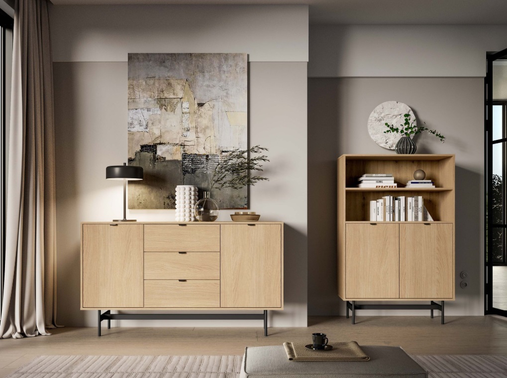 Nábytok je vyrobený z kvalitných drevotrieskových alebo MDF dosiek s odolnou povrchovou úpravou v dekore dub Mavelie Natural, ktorá je vhodná na každodenné používanie a zároveň sa ľahko udržiava. Použité kovanie, ako je, push systém a mechanizmy tichého dovierania, zaručuje dlhú životnosť a komfort pri používaní. Čistiť mäkkou, mierne vlhkou handričkou a jemnými prostriedkami. Nepoužívať agresívne ani abrazívne čistiace prostriedky a po čistení vždy utrieť do sucha.