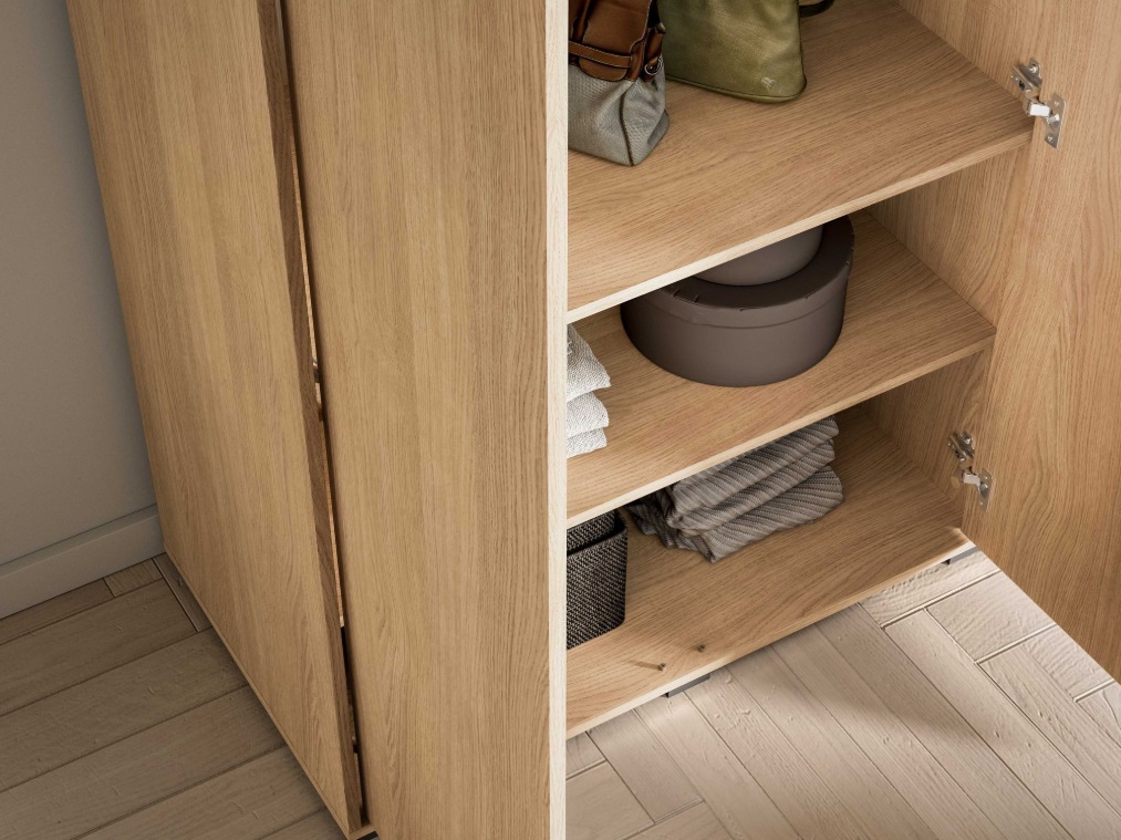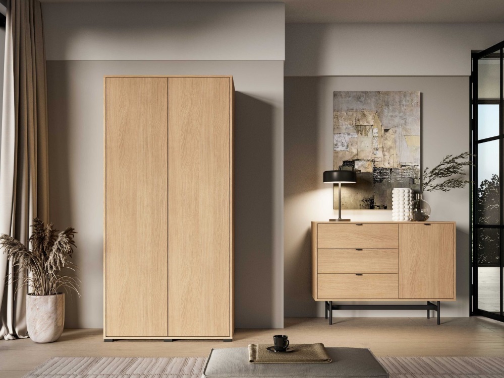 Šatníková skriňa SORENY 01 je navrhnutá pre moderné interiéry, v ktorých sa spája elegantný dizajn, jednoduchosť a funkčnosť. Dekor dub Mavelie Natural prináša do priestoru prirodzený a teplý vzhľad, zatiaľ čo minimalistická forma dodáva nábytku nadčasový charakter. Praktickosť nábytku zvyšujú funkčné riešenia, ako je systém push-to-open a pánty s tichým dovieraním, ktoré zabezpečujú pohodlné a tiché používanie. Šatníková skriňa je určená na zariadenie obývacej izby aj spálne, vďaka čomu umožňuje vytvoriť jednotný a harmonický interiér v celom byte.