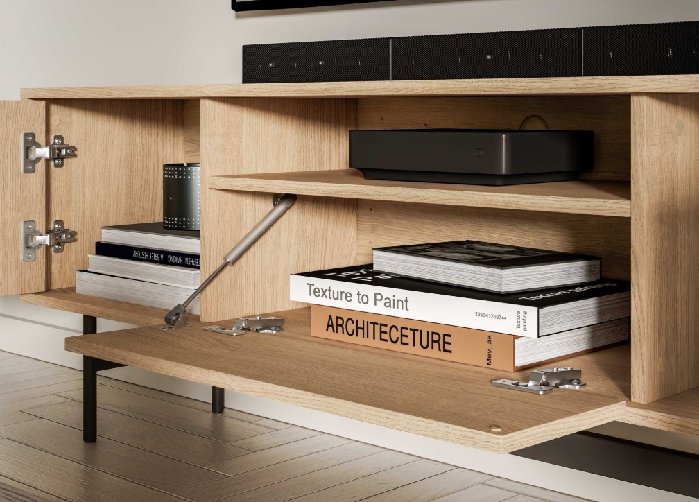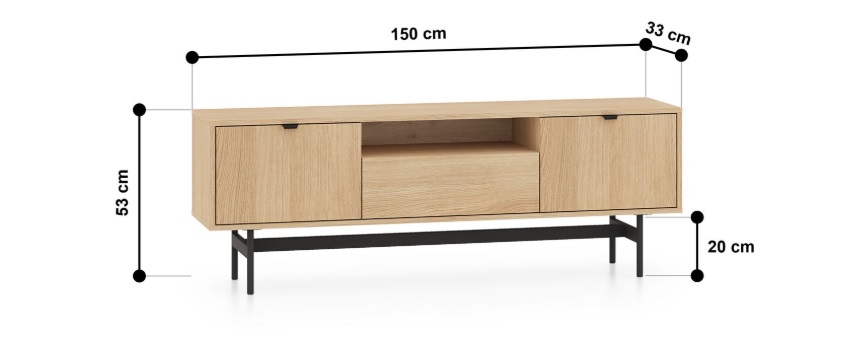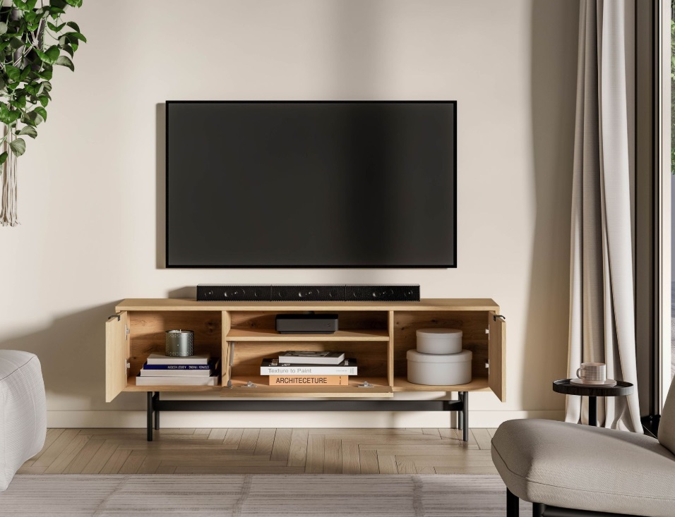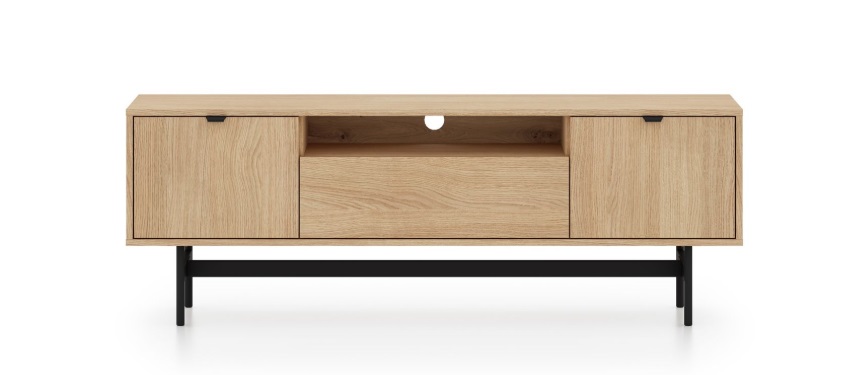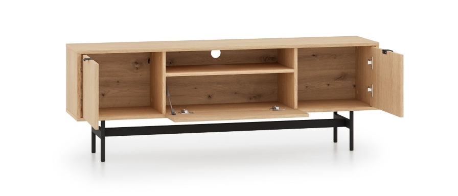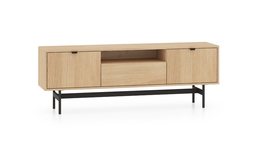 TV stolík SORENY 06 je navrhnutý pre moderné interiéry, v ktorých sa spája elegantný dizajn, jednoduchosť a funkčnosť. Dekor dub Mavelie Natural prináša do priestoru prirodzený a teplý vzhľad, zatiaľ čo minimalistická forma dodáva nábytku nadčasový charakter. Nábytok je postavený na ľahkej kovovej konštrukcii, ktorá mu dodáva vzdušnosť a moderný vzhľad. Praktickosť nábytku zvyšujú funkčné riešenia, ako je systém push-to-open a pánty s tichým dovieraním, ktoré zabezpečujú pohodlné a tiché používanie. Tv stolík je určený na zariadenie obývacej izby, vďaka čomu umožňuje vytvoriť jednotný a harmonický interiér v celom byte.