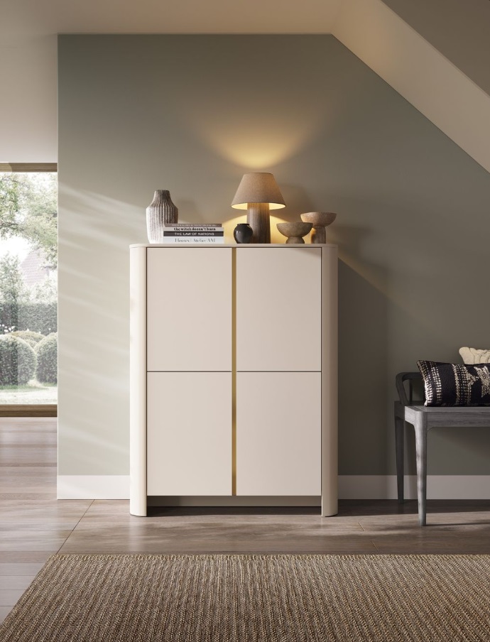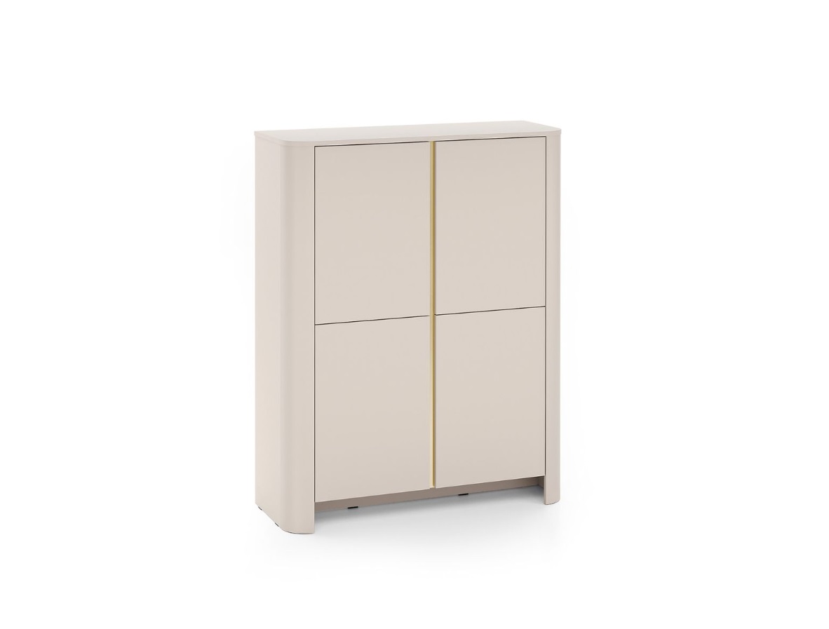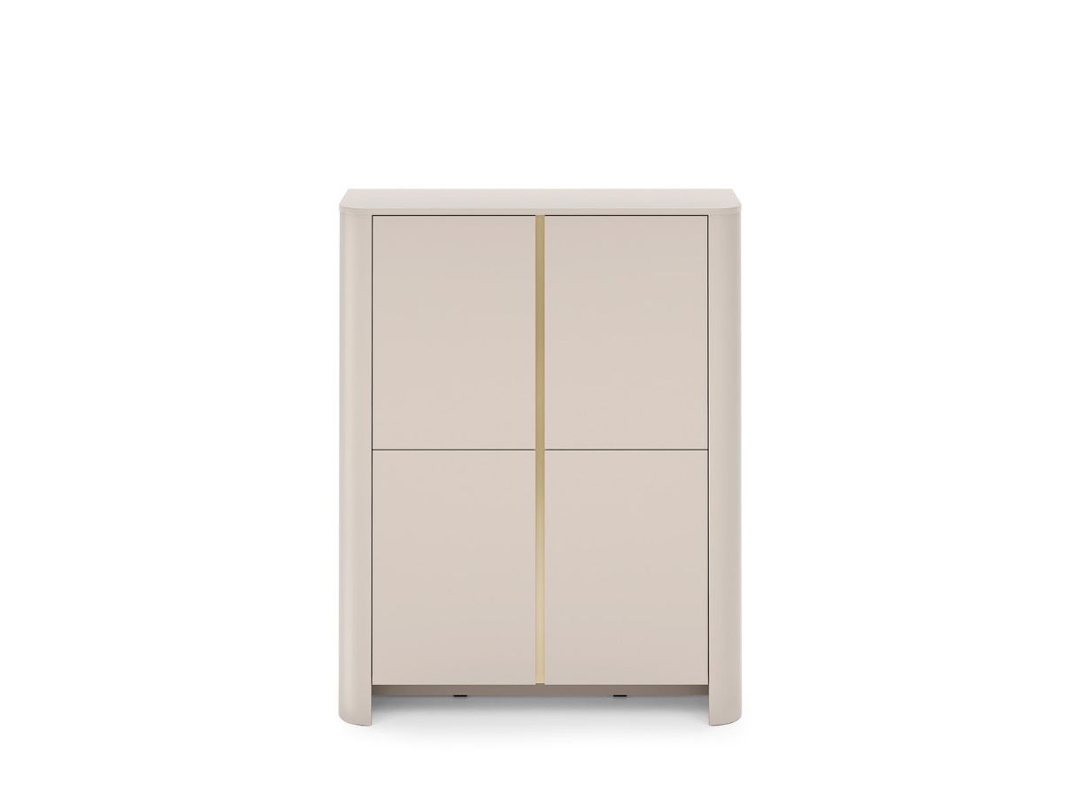 Zostava ABRIN je moderný nábytok určený do obývacej izby, spálne alebo izby pre mládež. Umožňuje praktické a esteticky vyvážené usporiadanie priestoru podľa vašich potrieb. Farebná prevedenie cashmere spolu so zaoblenými líniami prináša do interiéru jemnú eleganciu a nadčasový minimalistický štýl. Komoda je štvordverová s policami. Komoda má otváranie systémom „push to open„, ktorý navyše zdôrazňuje jej moderný charakter a zaisťuje komfort používania.