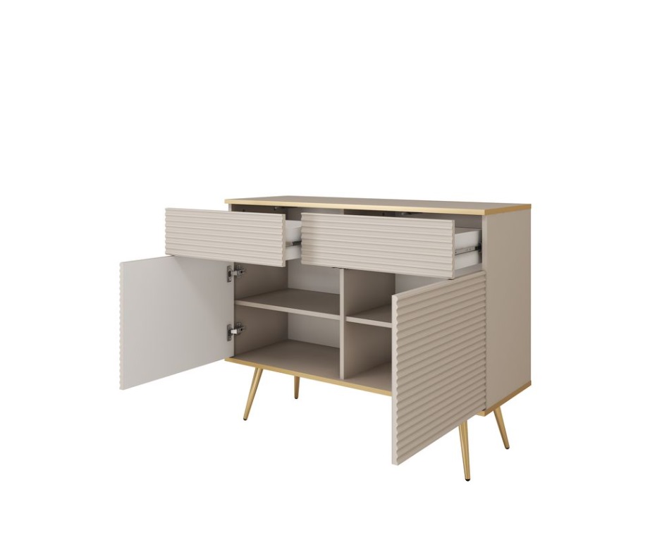 Veľmi pekná komoda BIJOU K-107 v jemnej bielej farbe so zlatými nohami vnáša do interiéru pocit ľahkosti a harmónie. Vďaka svojmu univerzálnemu prevedeniu sa dokonale hodí k rôznym štýlom a farebným kombináciám. Dvierka sú vybavené praktickým systémom „push to open“, ktorý umožňuje tiché a pohodlné otváranie jednoduchým zatlačením na čelo nábytku. Originálne frézované čelá so zlatým lemovaním dodávajú komode jedinečný a luxusný vzhľad. Komoda je priestranná so zásuvkami a dvierkami ponúka veľkorysý úložný priestor, ktorý oceníte v každej domácnosti.