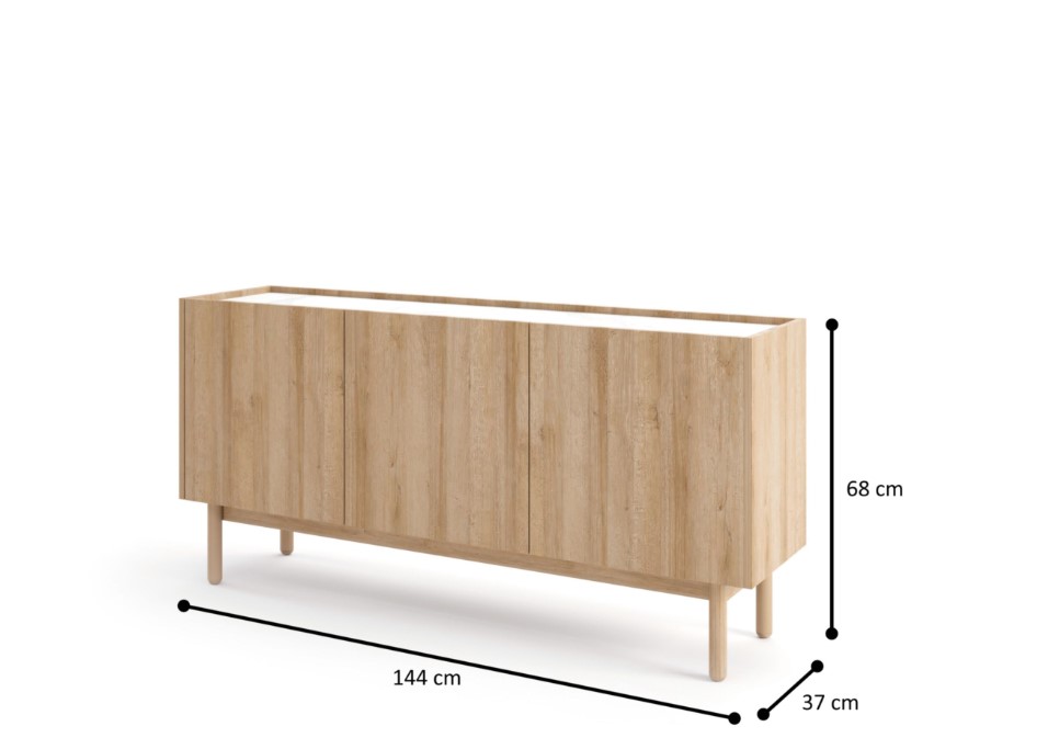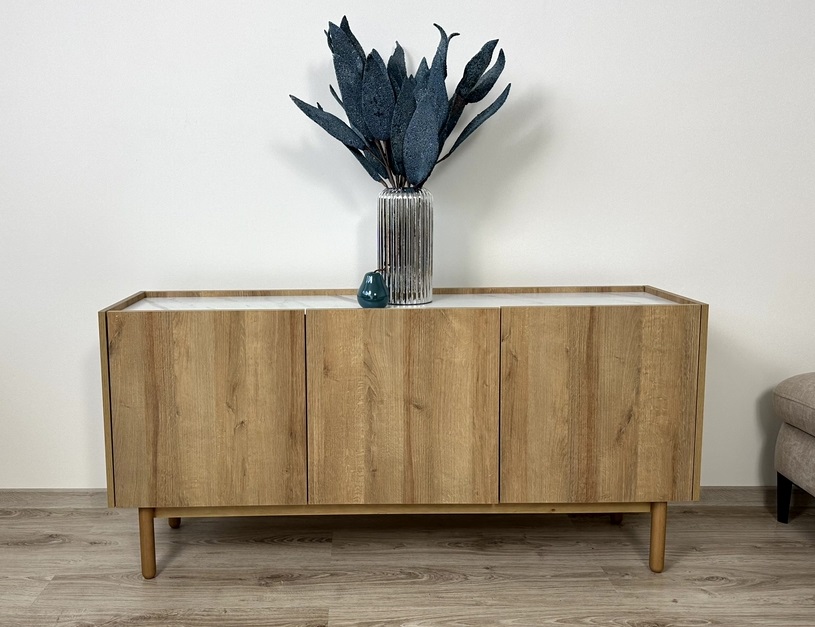 Moderná komoda CHIC K144 vysoká 68 cm s jemnou textúrou dekoru dub riviera je zaujímavo oživená mramorovým vzorom na vrchnej doske. Vďaka vysokým nohám dodáva komoda CHIC interiéru pocit vzdušnosti a ľahkosti. Oblý tvar nožičiek s malým soklom zaručujú dostatočnú stabilitu a ľahký prístup pre čistenie podlahy. Komoda je bezúchytová, otváranie je zabezpečené pomocou prevýšených okrajov dvierok, vďaka čomu sa prakticky a jednoducho dostanete k uloženým veciam. Kvalitný materiál s ABS hranami zaručuje dlhodobé bezproblémové používanie. Komoda má tri dvierka, ktoré ukrývajú 3 police. Zariaďte si interiér elegantne a moderne.