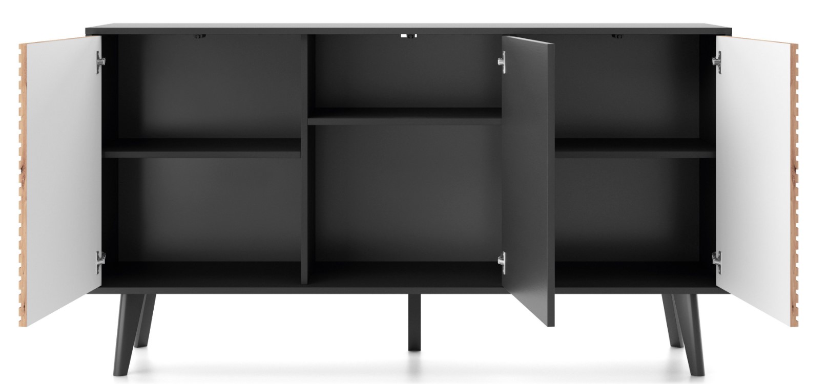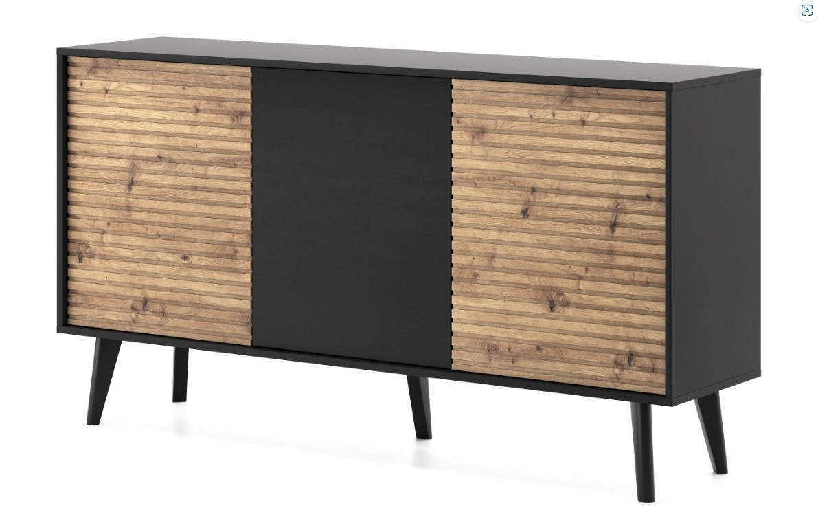 Elegantná komoda SALLOW K154 v čiernej farbe je oživená dvierkami v dekore dub artisan so zaujímavým frézovaním. Komoda má moderný dizajn a vynikajúcu funkčnosť, ktorá vám pomôže udržiavať vaše veci organizované a usporiadané. Komoda nemá tradičné úchytky, otváranie je zabezpečené pomocou systému PUSH TO OPEN. Osloví vás priestrannosť komody, tri dvierka poskytujú dostatok úložného priestoru. Zariaďte si domov funkčným a moderným nábytkom z kolekcie SALLOW.