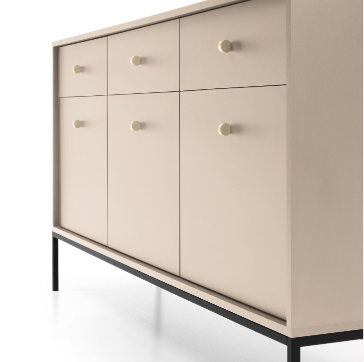 Moderná komoda SORTI je vyrobená zo 16 mm laminovanej dosky s ABS hranami. Vyššie kovové nohy a minimalistické kovové úchytky dodávajú komode šmrnc. Prach stačí utrieť vlhkou handričkou.