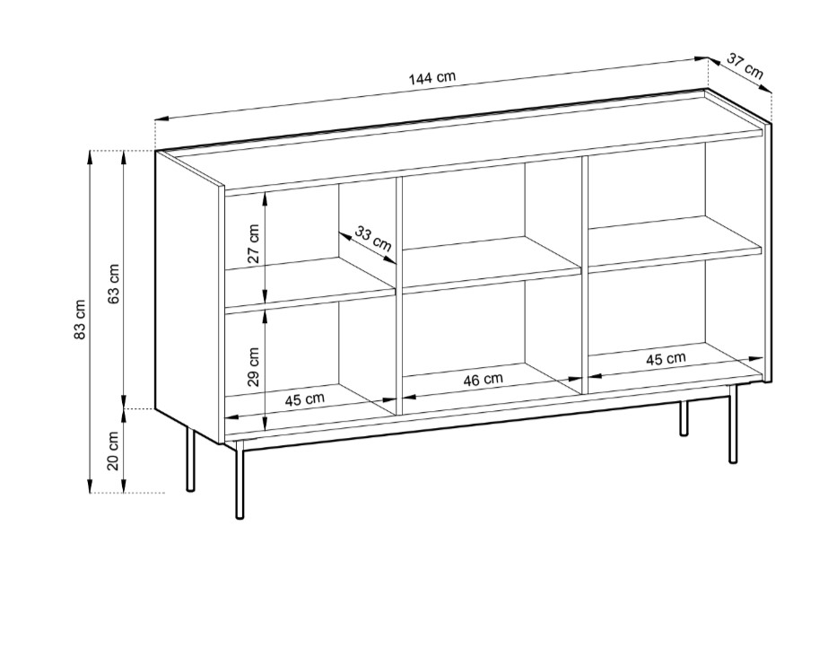 Priestranná komoda TONNE je vyrobená zo 16 mm laminovanej dosky s ABS hranami. Vyššie kovové nohy komodu odľahčujú, materiál je kvalitný, nevyžaduje špeciálnu starostlivosť.