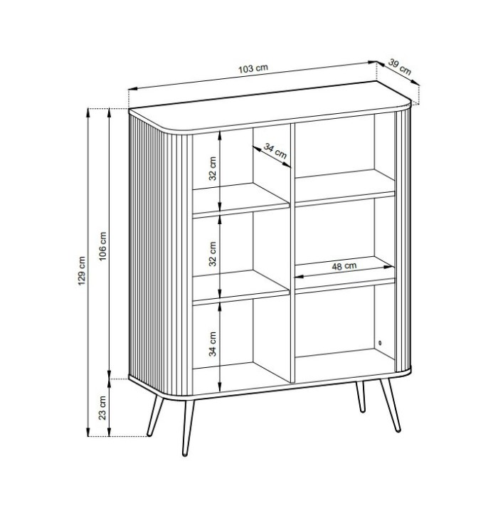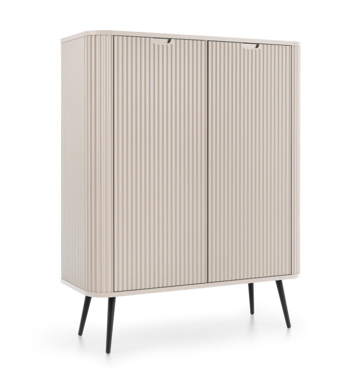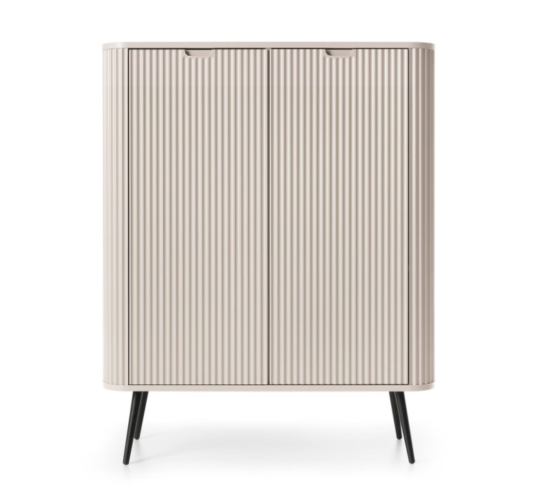 Vysoká a nadčasová komoda ZEVA K-103 v cashmere farbe s kombináciou čiernych vysokých nôh v matnom prevedení. Nohy sú vysoké 23 cm čo je vhodné pre robotický vysávač. Komoda kombinuje moderný dizajn s praktickými funkciami, čo ju robí ideálnou voľbou pre každý interiér. Komoda je dvojdielna s dvomi dvierkami za, ktorými sú police. Inšpirujte sa našou jedinečnou ponukou a vytvorte si jedinečný domov.