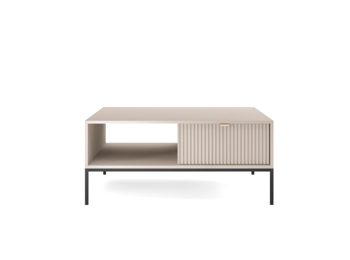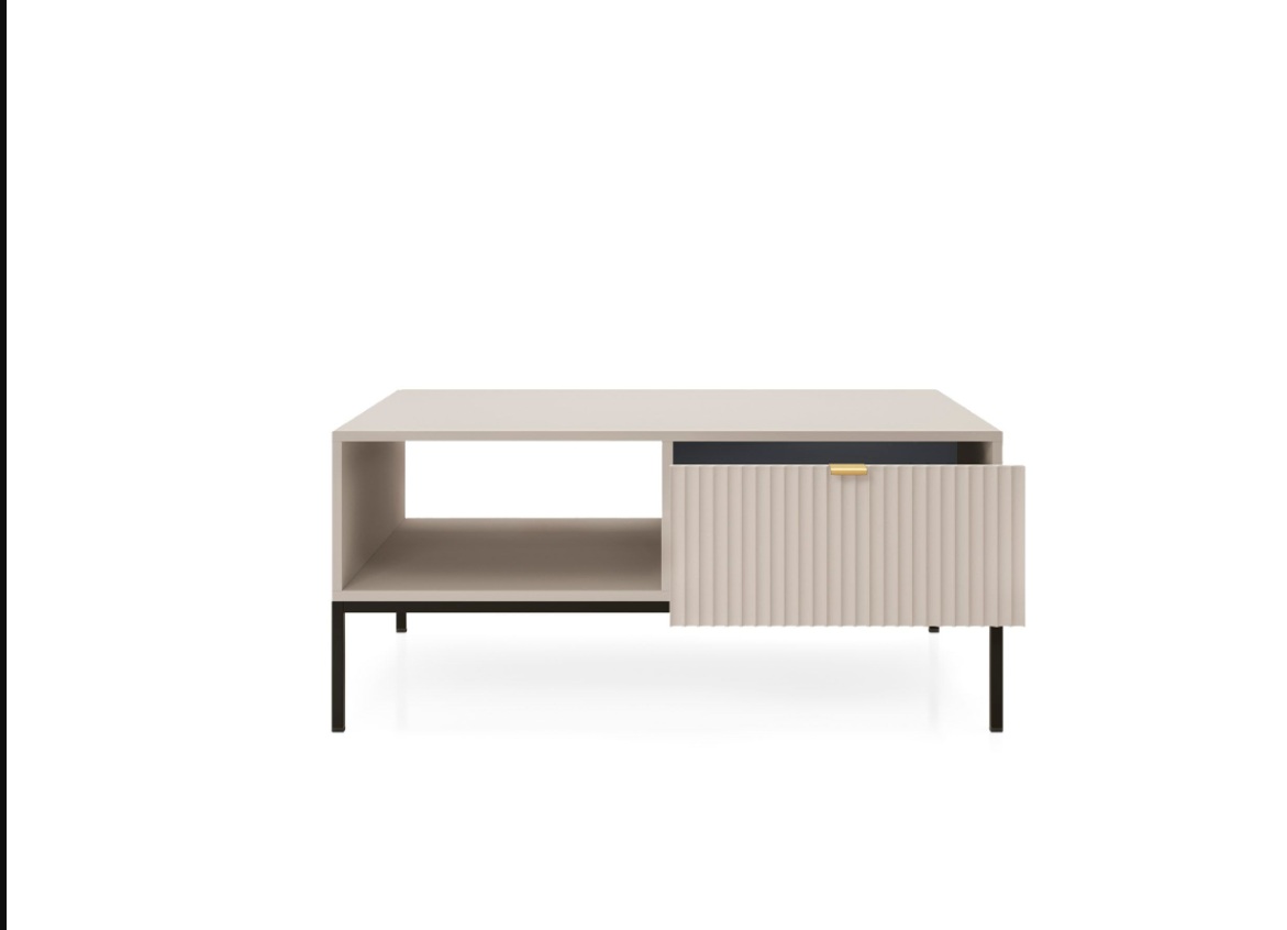 Konferenčný stolík MONA L-104 | cashmere má korpus zo 16 mm lamina, dvierka z 18 mm MDF. Nenápadné úchytky v zlatej farbe ho dopĺňajú. Pôsobivý kontrast tvoria čierne nohy z lakovanej ocele s práškovou úpravou. Nábytok má ABS hrany. Čistenie je jednoduché a rýchle – stačí použiť navlhčenú handričku alebo vhodný čistiaci prostriedok na nábytok.