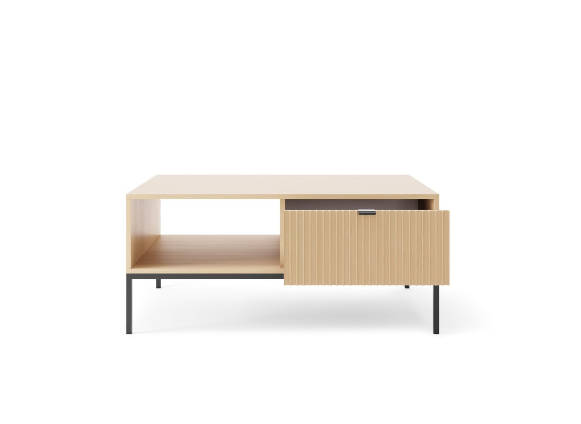 Konferenčný stolík MONA L-104 má korpus zo 16 mm lamina, dvierka z 18 mm MDF. Nenápadné úchytky v zlatej farbe ho dopĺňajú. Pôsobivý kontrast tvoria čierne nohy z lakovanej ocele s práškovou úpravou. Nábytok má ABS hrany. Čistenie je jednoduché a rýchle – stačí použiť navlhčenú handričku alebo vhodný čistiaci prostriedok na nábytok.