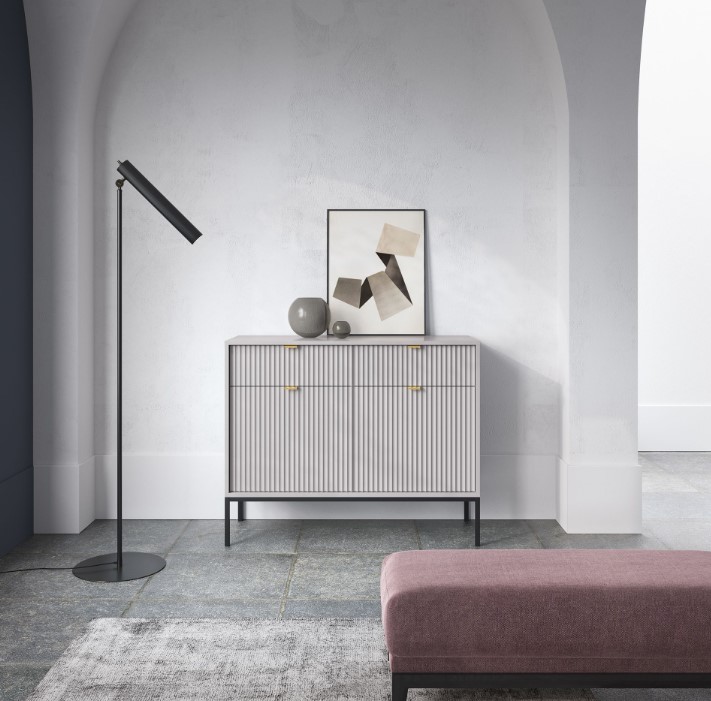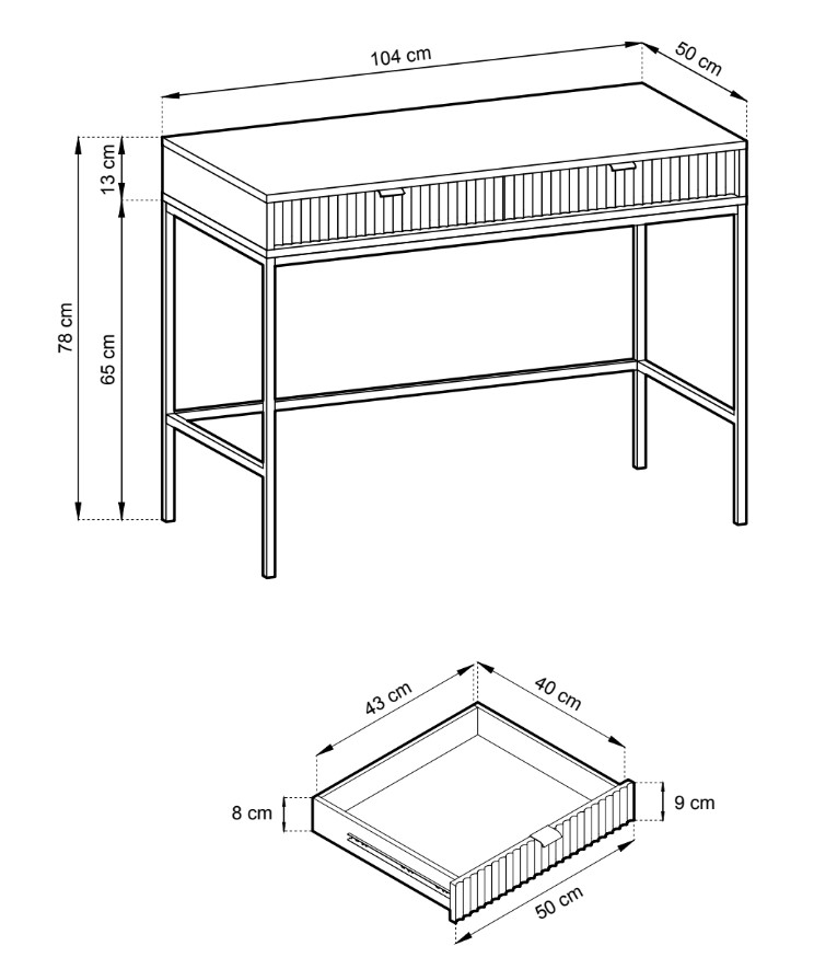Korpus toaletného stolíka MONA je vyrobený zo 16 mm lamina, dvierka z 18 mm MDF. Nenápadné úchytky v zlatej farbe ho dopĺňajú. Pôsobivý kontrast tvoria čierne nohy z lakovanej ocele s práškovou úpravou.