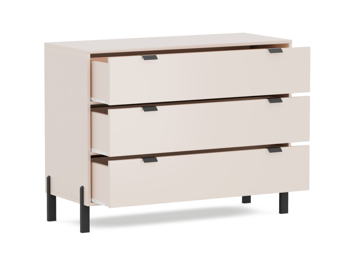 Komoda CREMONA 3S je vyrobená v svetlom farebnom prevedení v tóne cashmere, ktorá prináša príjemnú atmosféru. Komodu dopĺňajú elegantné čierne úchytky a vysoké nohy, dodávajúce nábytku jedinečný štýl. Komoda je priestranná má tri zásuvky. Pre vytvorenie prirodzeného, útulného a pokojného interiéru, ktorý podporuje relaxáciu, je nábytok Cashmere tou ideálnou voľbou.