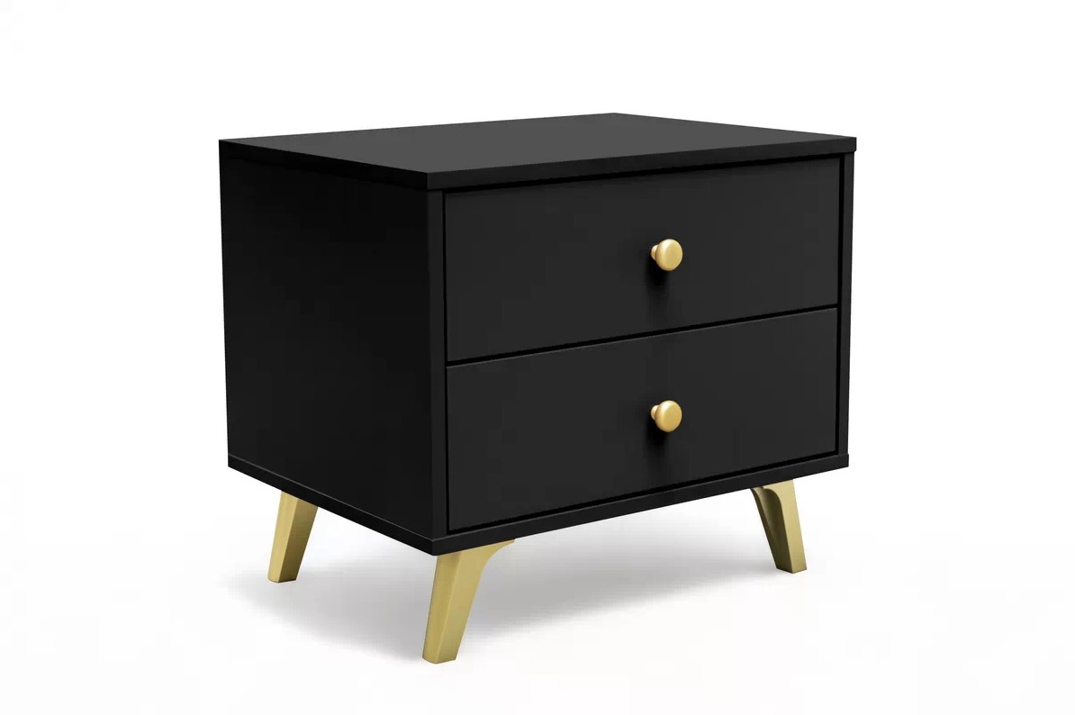 Farebná kolekcia SIENA vznikla spojením moderného štýlu a minimalizmu. Nočný stolík SIENA je jednoduchý nočný stolík na kovových nohách, má tri zásuvky a dvoje dvierka s poličkami. V interiéri vynikne vďaka zlatým úchytkám a vysokým nohám. Stolík je v krásnom čiernom farebnom prevedení.