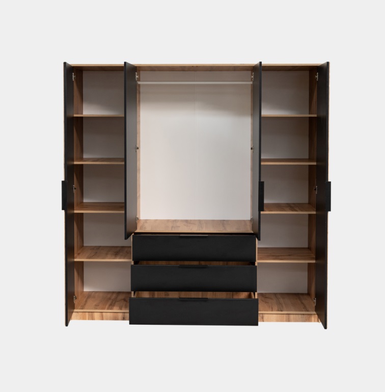 Priestranná šatníková skriňa BALI LUX D4 s nadstavcom je výbornou voľbou do každej spálne, ktorá potrebuje množstvo úložného priestoru. Skriňa je vyrobená v obľúbenej bielej farbe, ktorú ozvláštňujú lamely z dubu wotan, tieto sú veľkým hitom. Šatníková skriňa BALI LUX D4 s nadstavcom je osemdverová so zrkadlami a 3 zásuvkami.