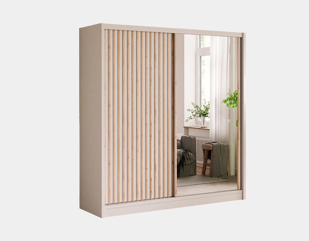 Šatníková skriňa LONDON 203 LUX je synonymom štýlu a pohodlia, ktoré uspokojí aj tých najnáročnejších používateľov. Jej nadčasový dizajn, jemná farebná kombinácia a spojenie elegantných lamiel s veľkým zrkadlom robia z nábytku dokonalý doplnok do moderných interiérov. Ideálne sa hodí nielen do spální, ale aj do šatníkov, predsiení či obývacích izieb. Predná časť skrine zaujme dekoratívnymi vertikálnymi lamelami, ktoré jej dodávajú jedinečný charakter a prinášajú do miestnosti útulnú a prirodzenú atmosféru. Veľké zrkadlo umiestnené na jednom z dverí nielenže plní praktickú funkciu pri každodennom výbere oblečenia, ale opticky zväčšuje priestor, čím miestnosť pôsobí jasnejšie a priestrannejšie.