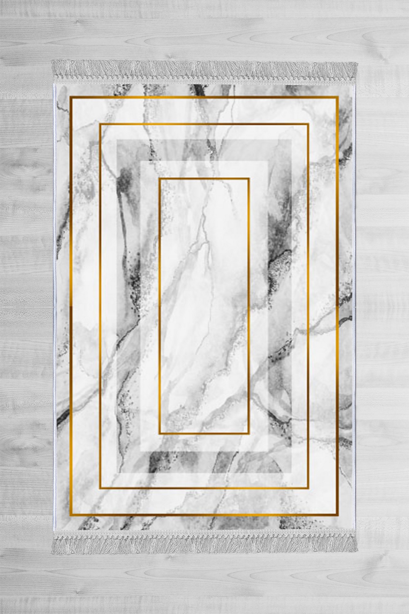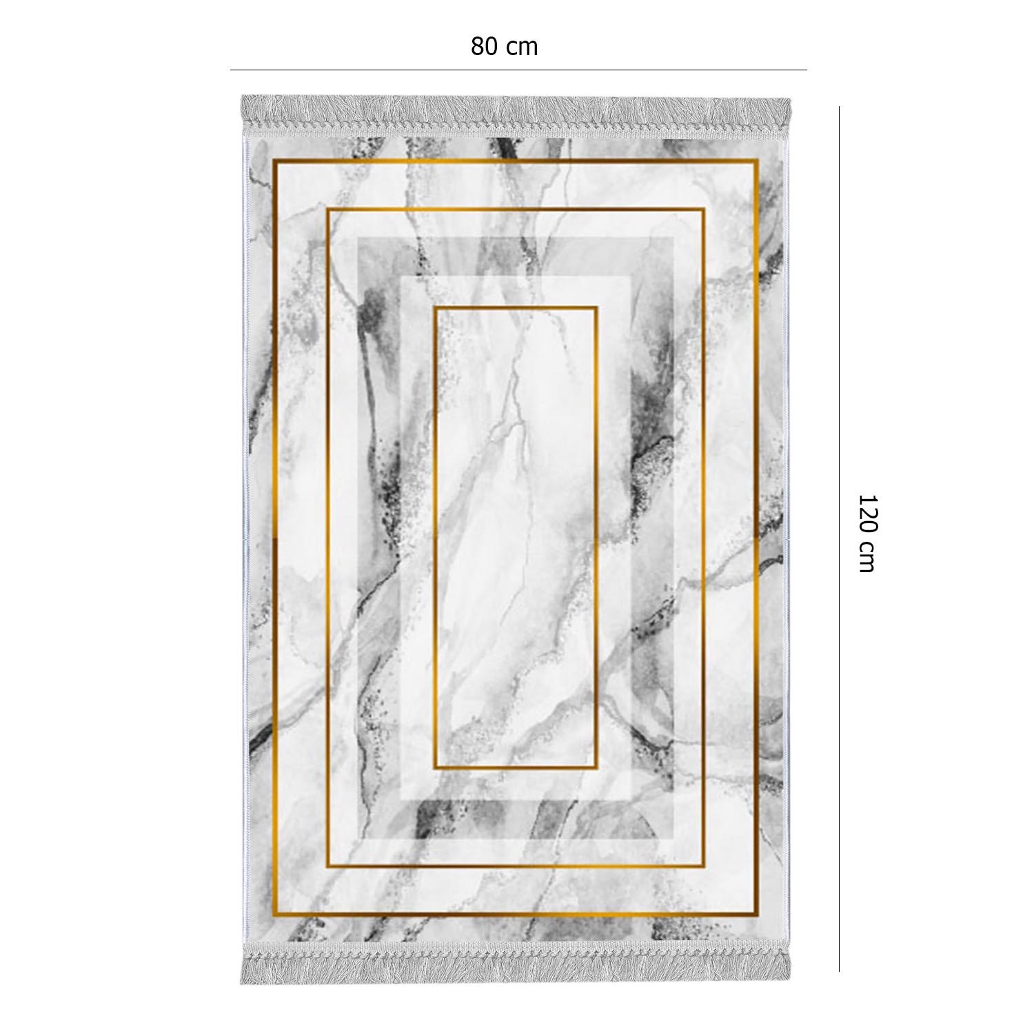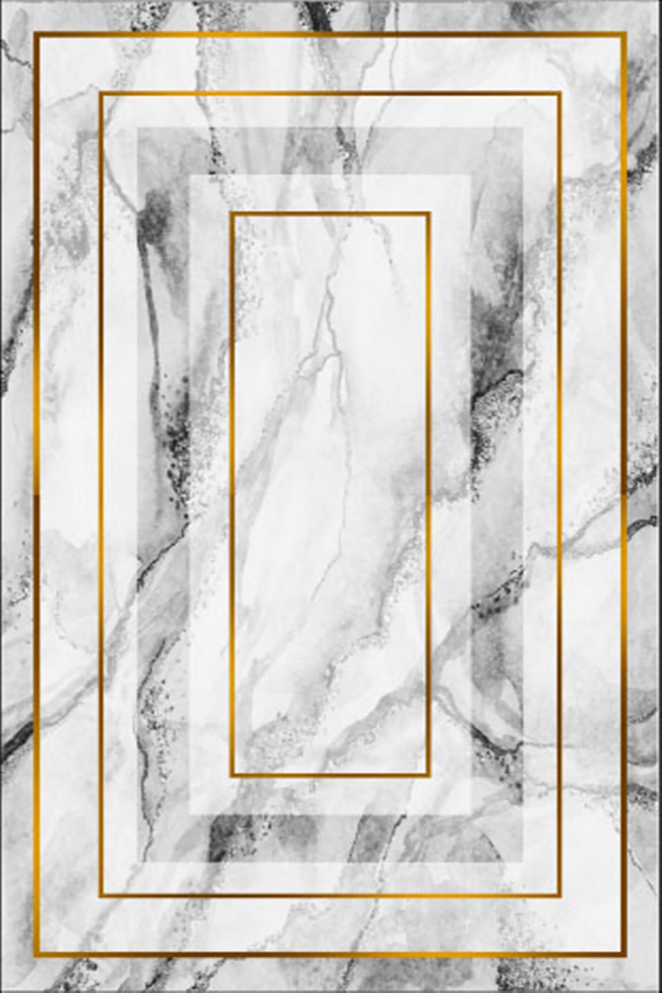 Biely koberec RAM s mramorovým vzorom a zlatými rámami.