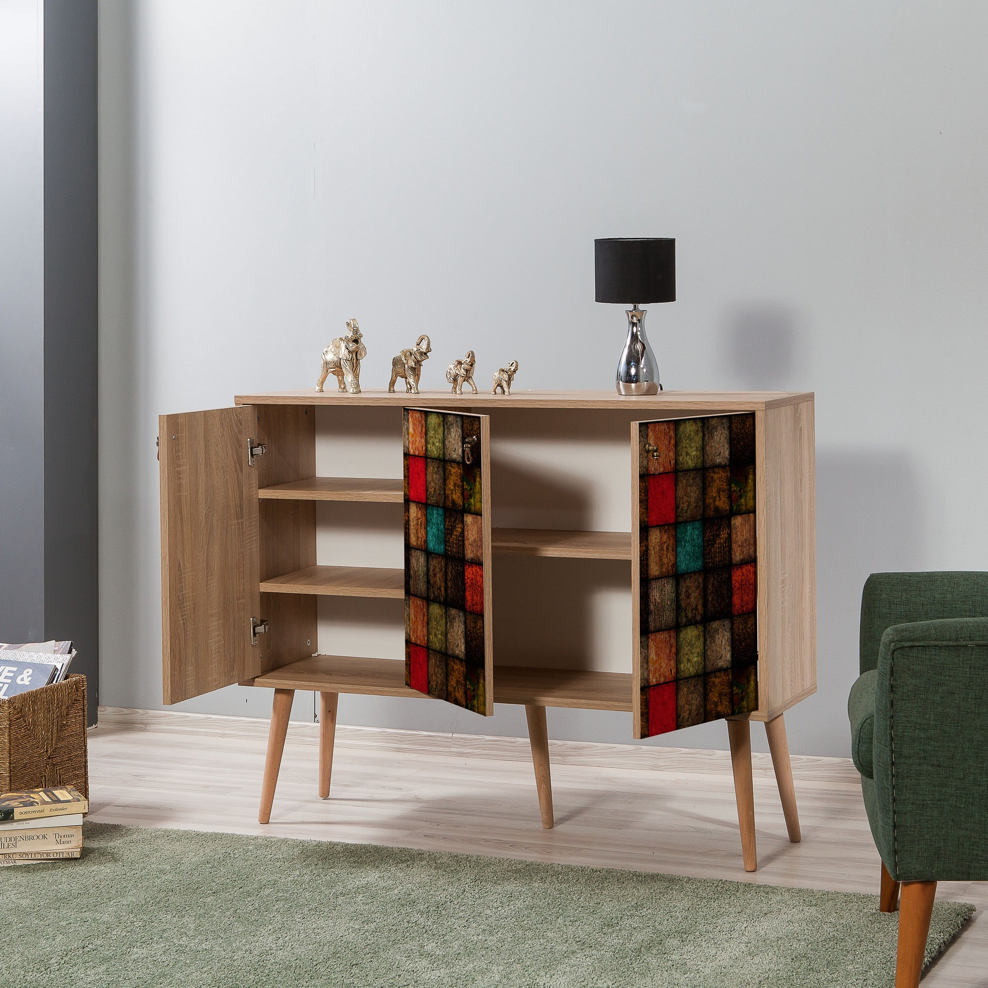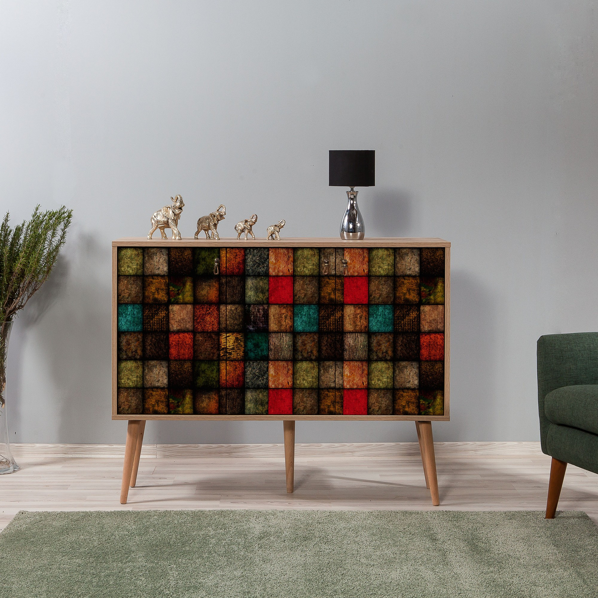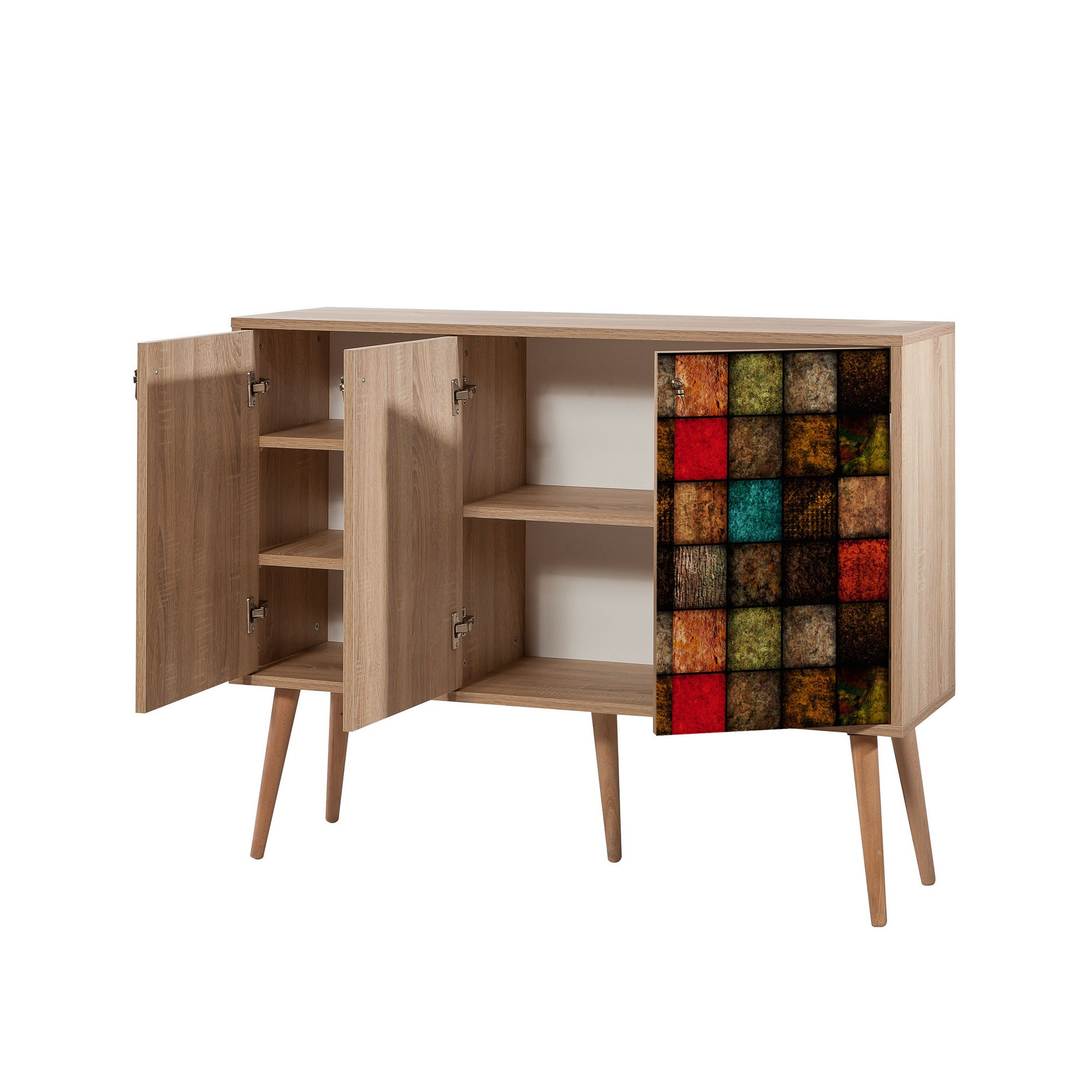 Komoda vo farbe dub sonoma s dvierkami s farebným dekorom.