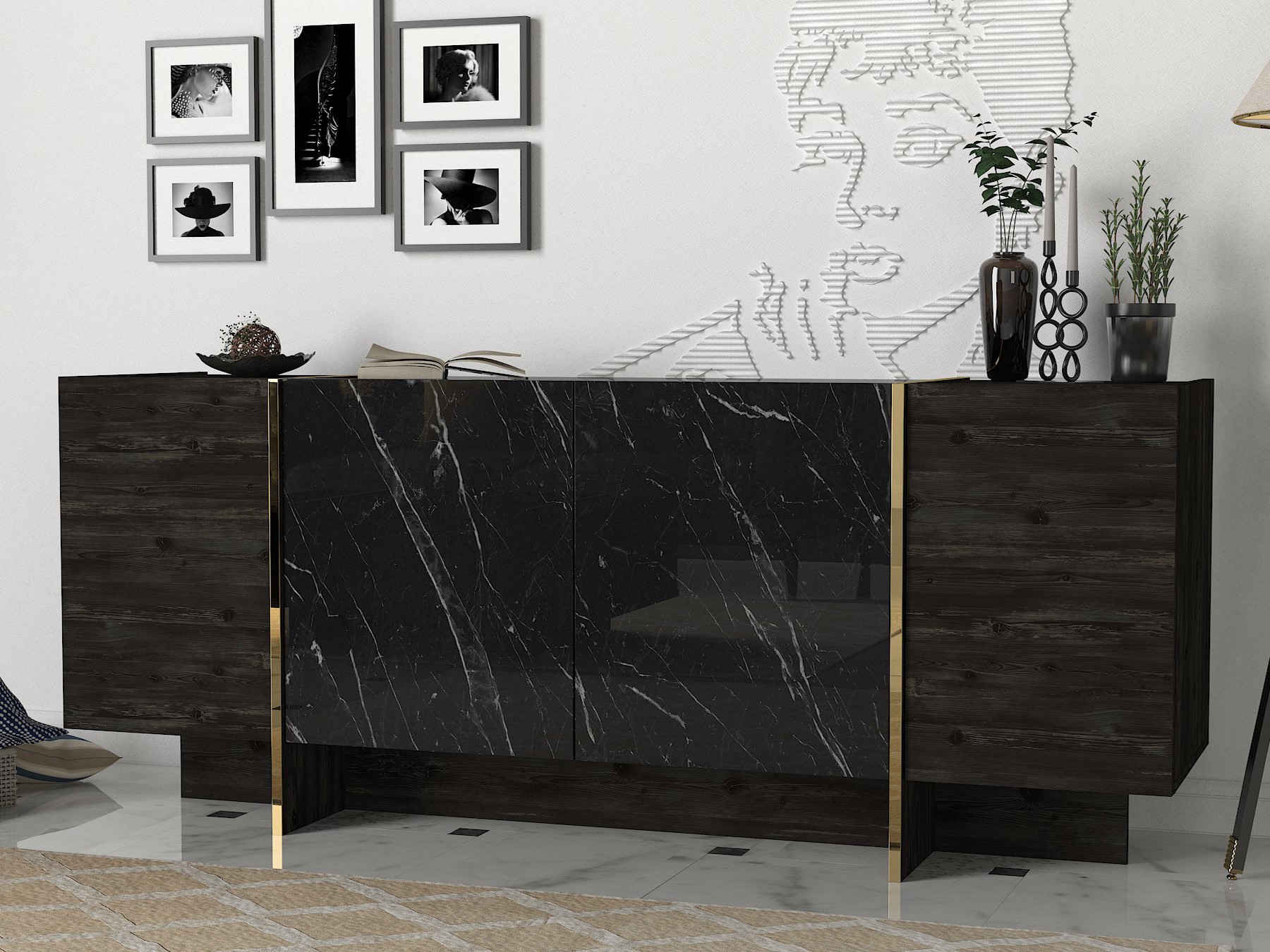 Široká policová komoda VEYRON kombinuje luxusný vzhľad čierneho mramoru s tmavým dreveným povrchom.