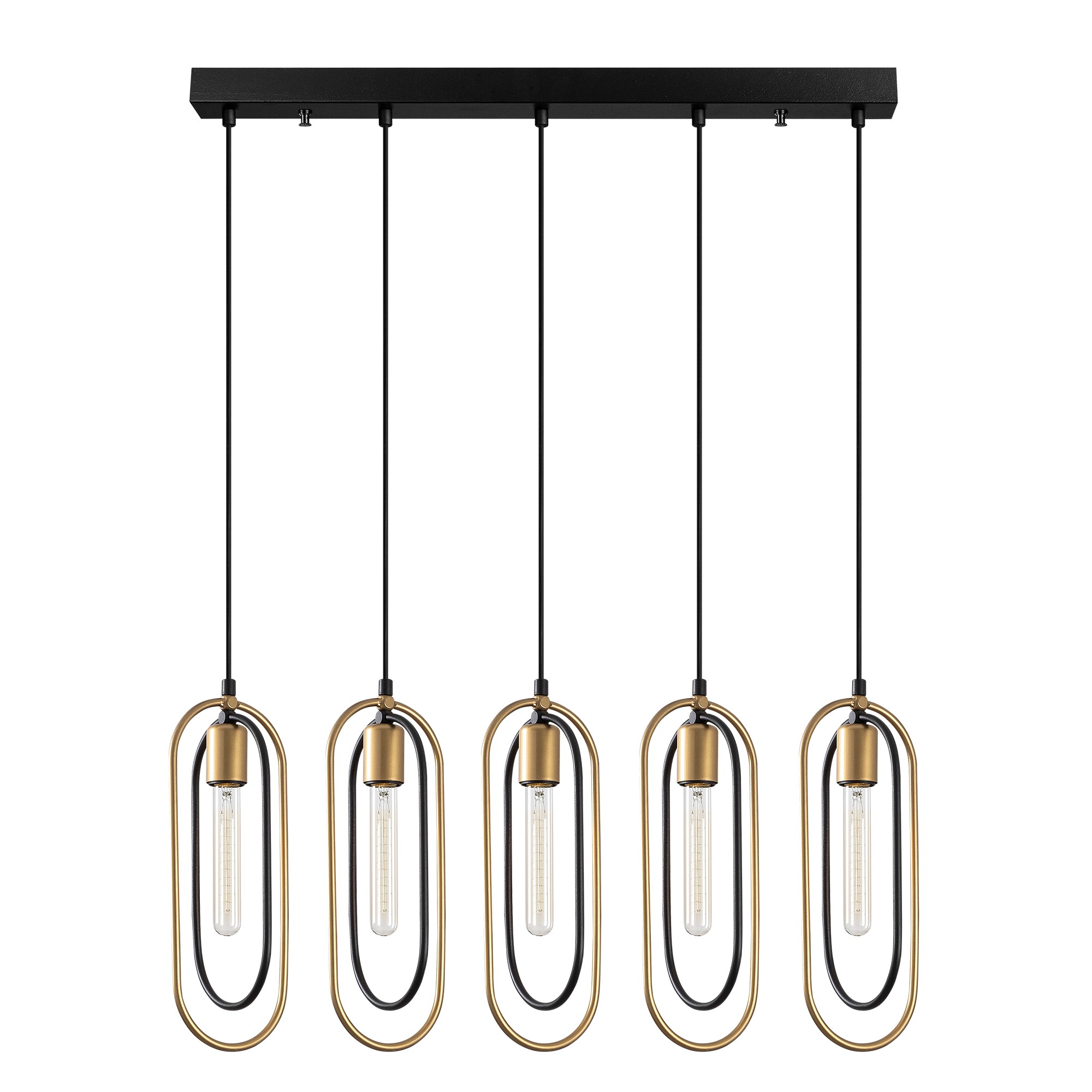 Päť sád elipsových útvarov lemujúcich podlhovasté telá žiaroviek sú dominantné prvky, ktorými na seba luster CERCO strháva pozornosť.