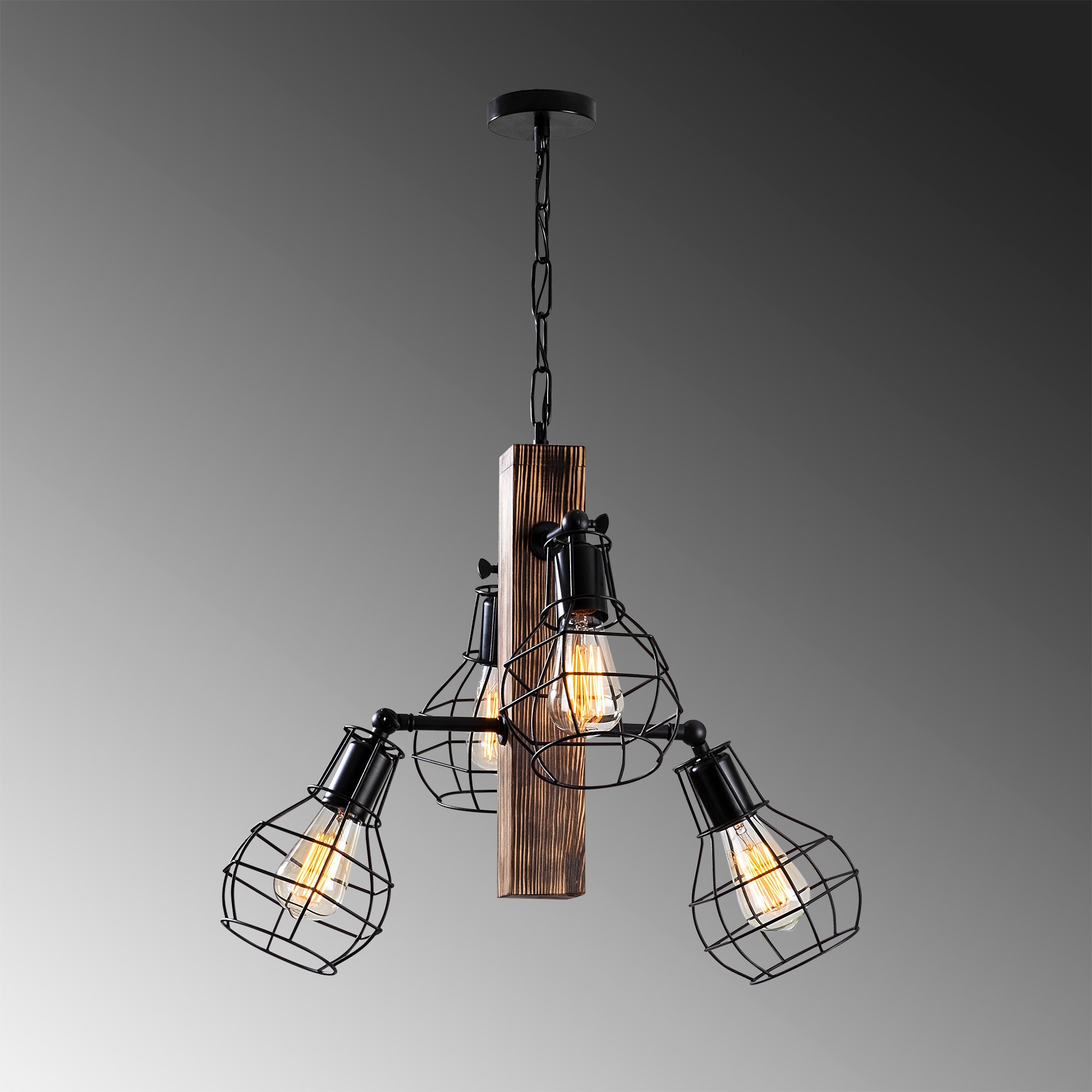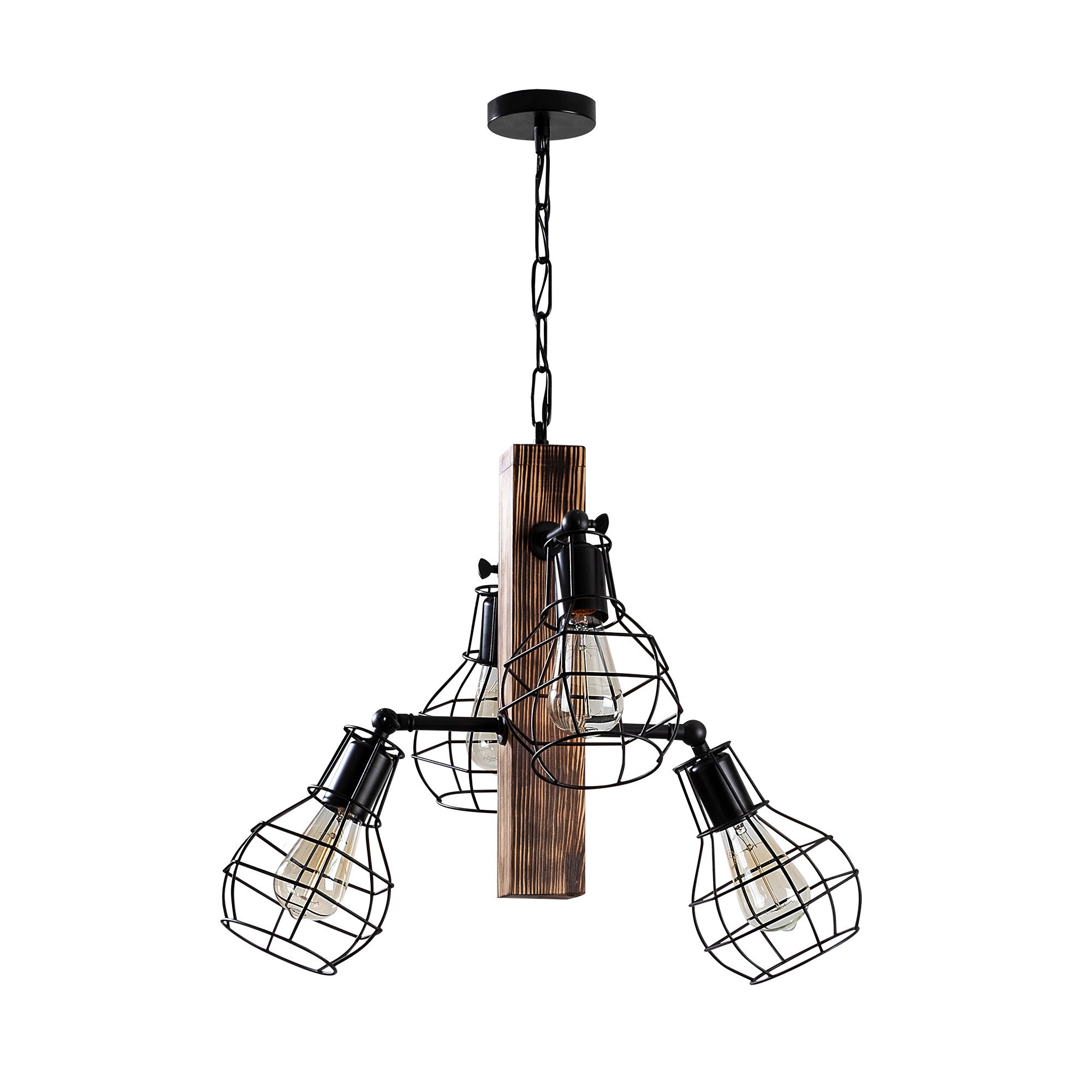 Luster EREBOS je tvorený kovovými tienidlami, ktoré sú rafinovane uchytené k stredovému drevenému hranolu visiacemu na krátkej reťazi.