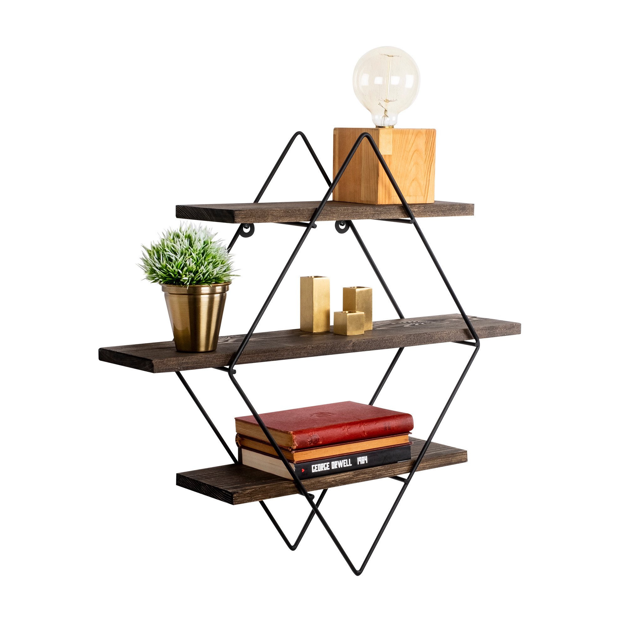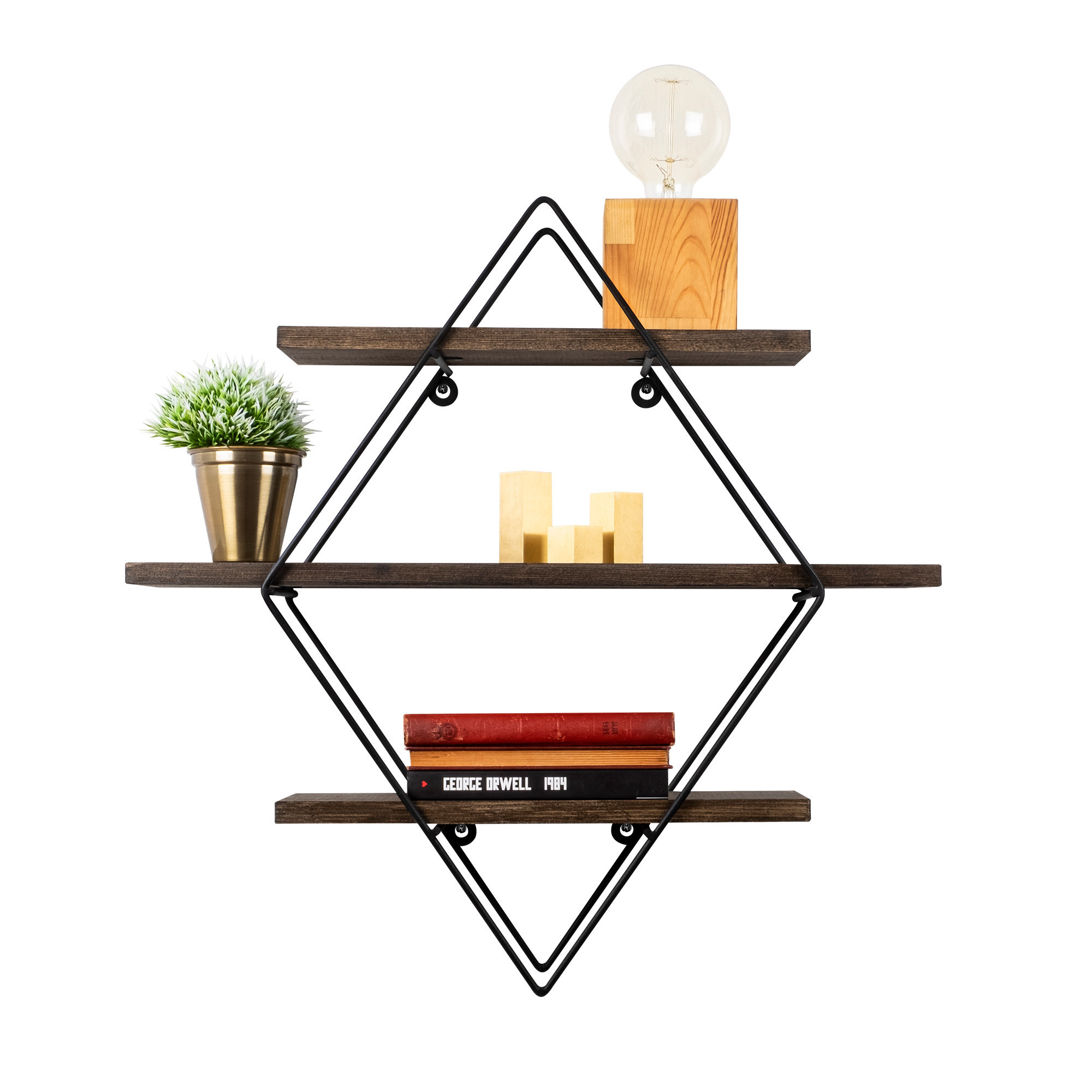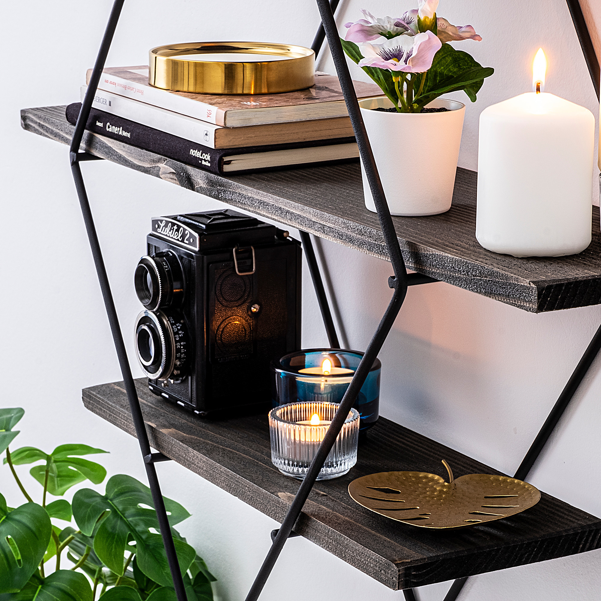 Nástenná rustikálna polica s kovovým rámom a tromi poličkami v dekore orech.