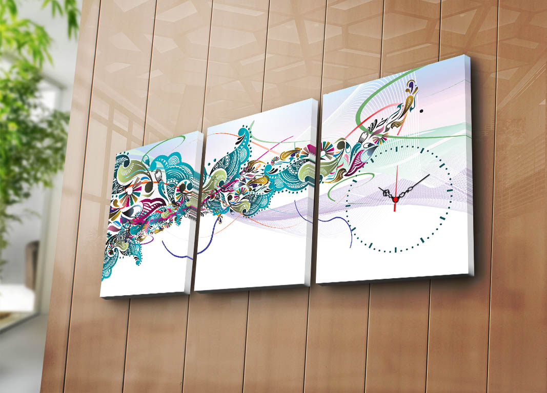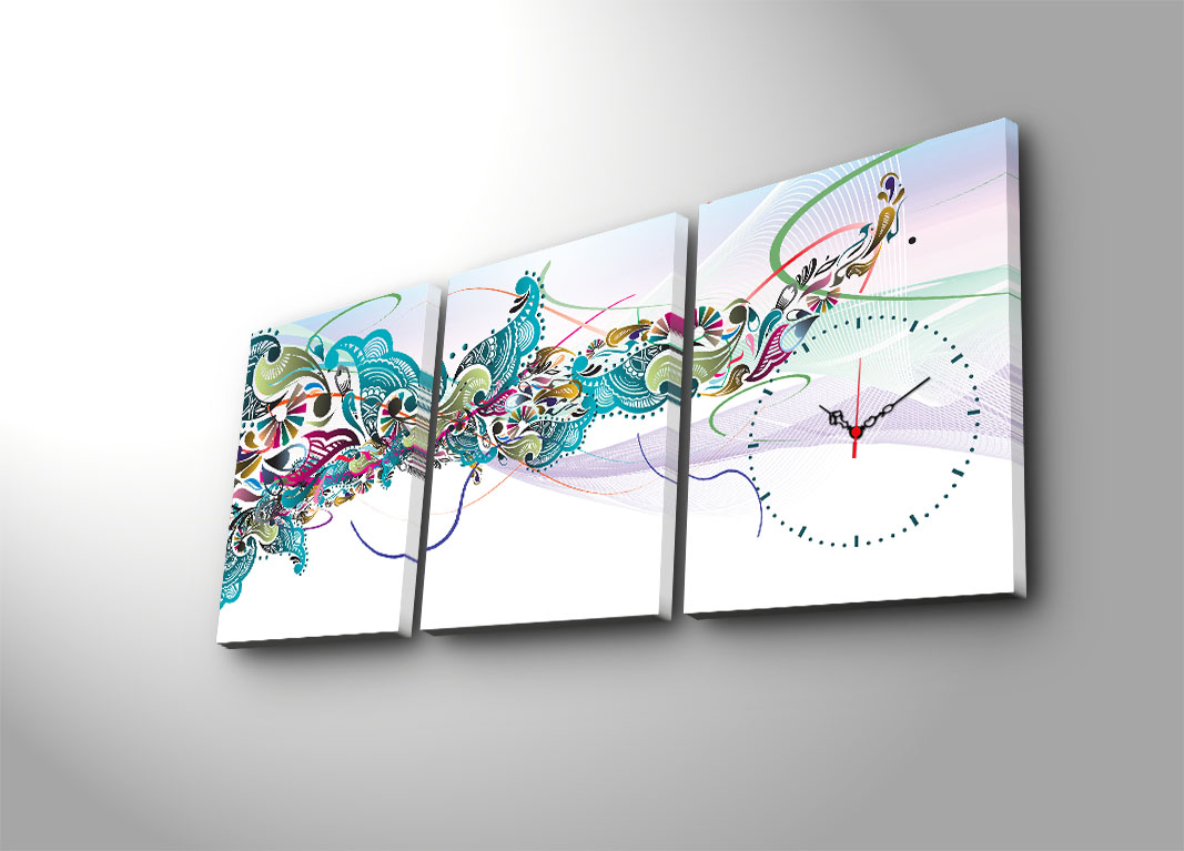Trojdielne nástenné hodiny na plátne s MODRÝMI ORNAMENTMI.