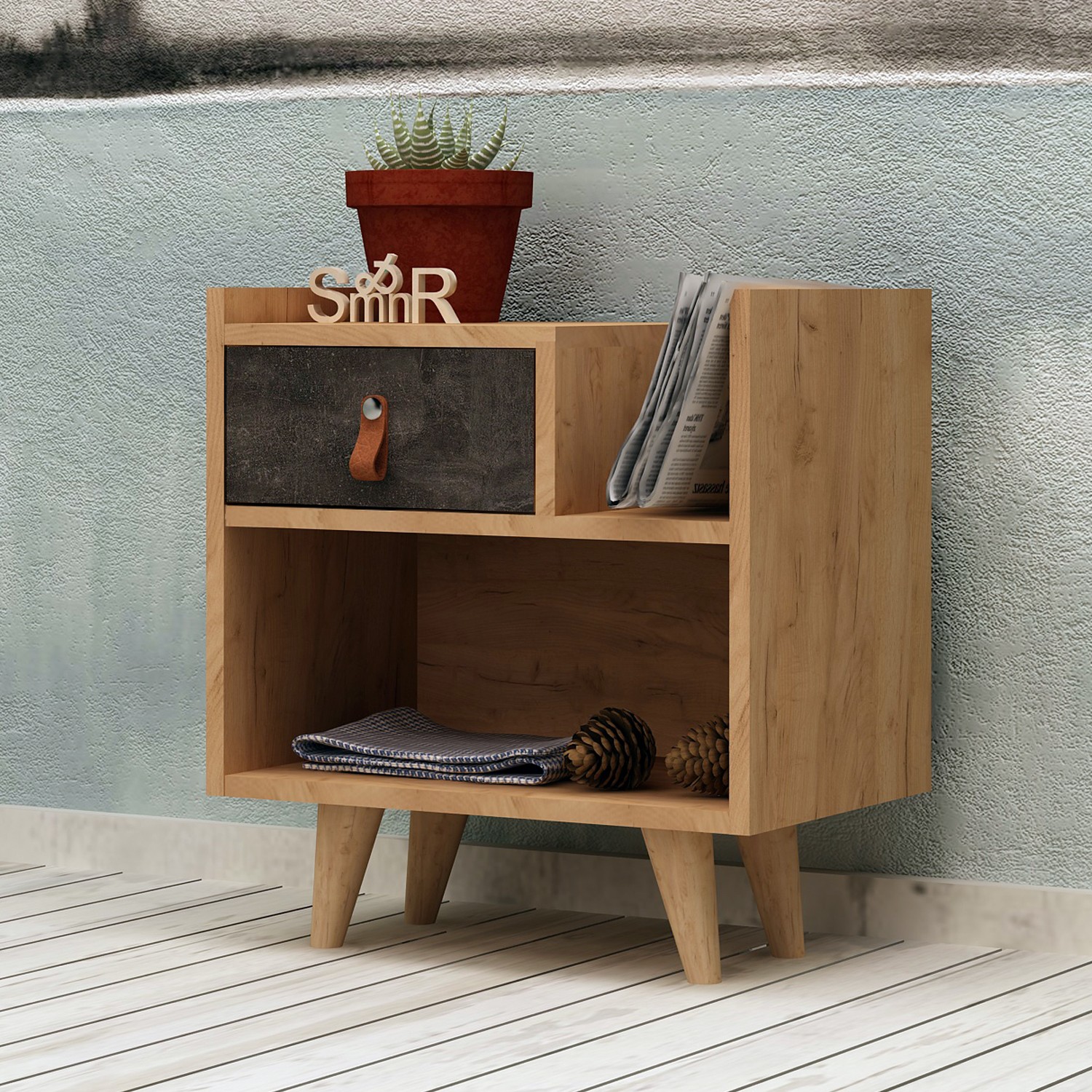 POLLA je nočný stolík s korpusom v dekore dreva dub, doplnený o zásuvku v dizajne betónu.