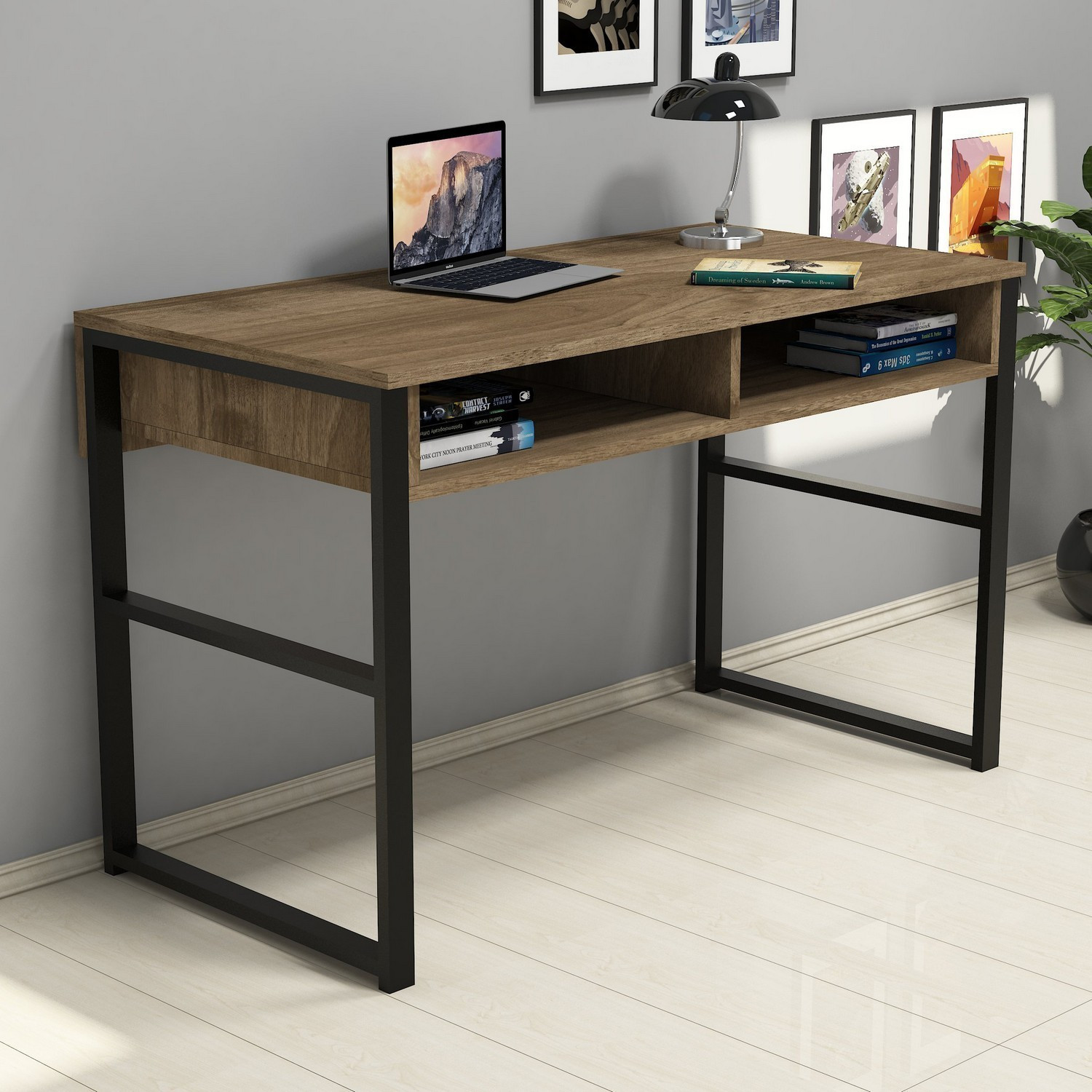 Moderný písací stôl s dvoma otvorenými policami v dekore orech. Na poličky môžete uložiť papiere alebo písacie potreby.
