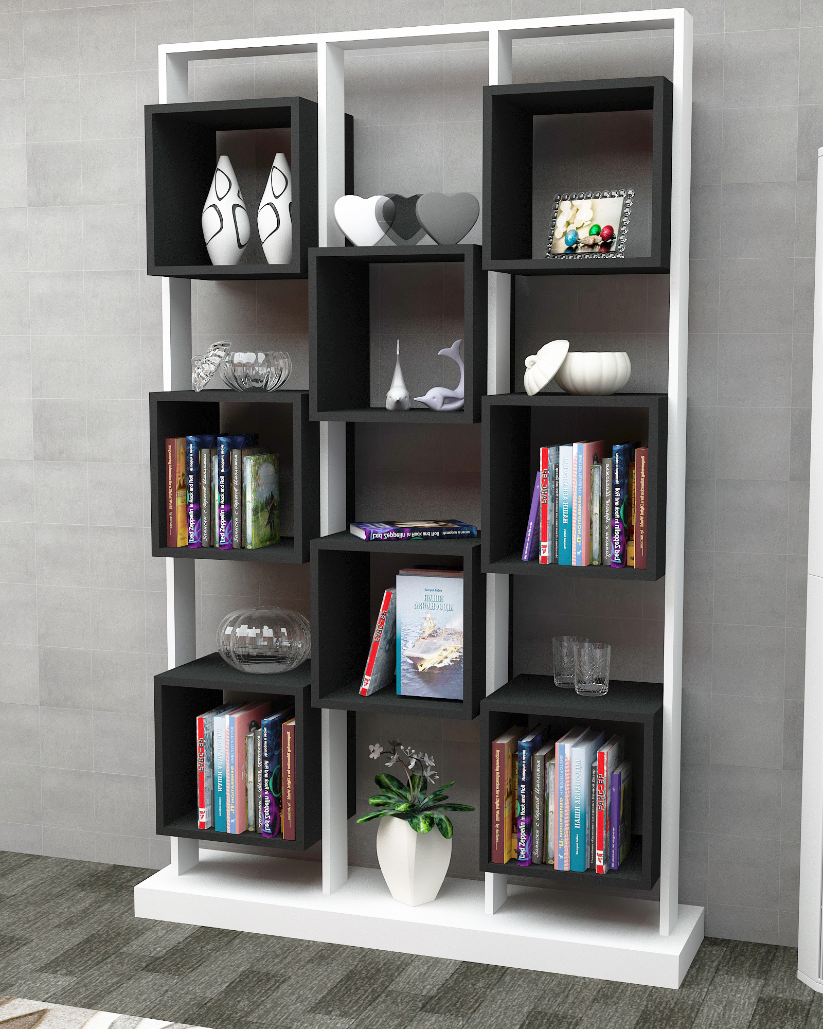Originálne tvarovaná knižnica bude dominantou každej miestnosti. Kontrast bieleho rámu a čiernych štvorcových políc ho robí neprehliadnuteľným