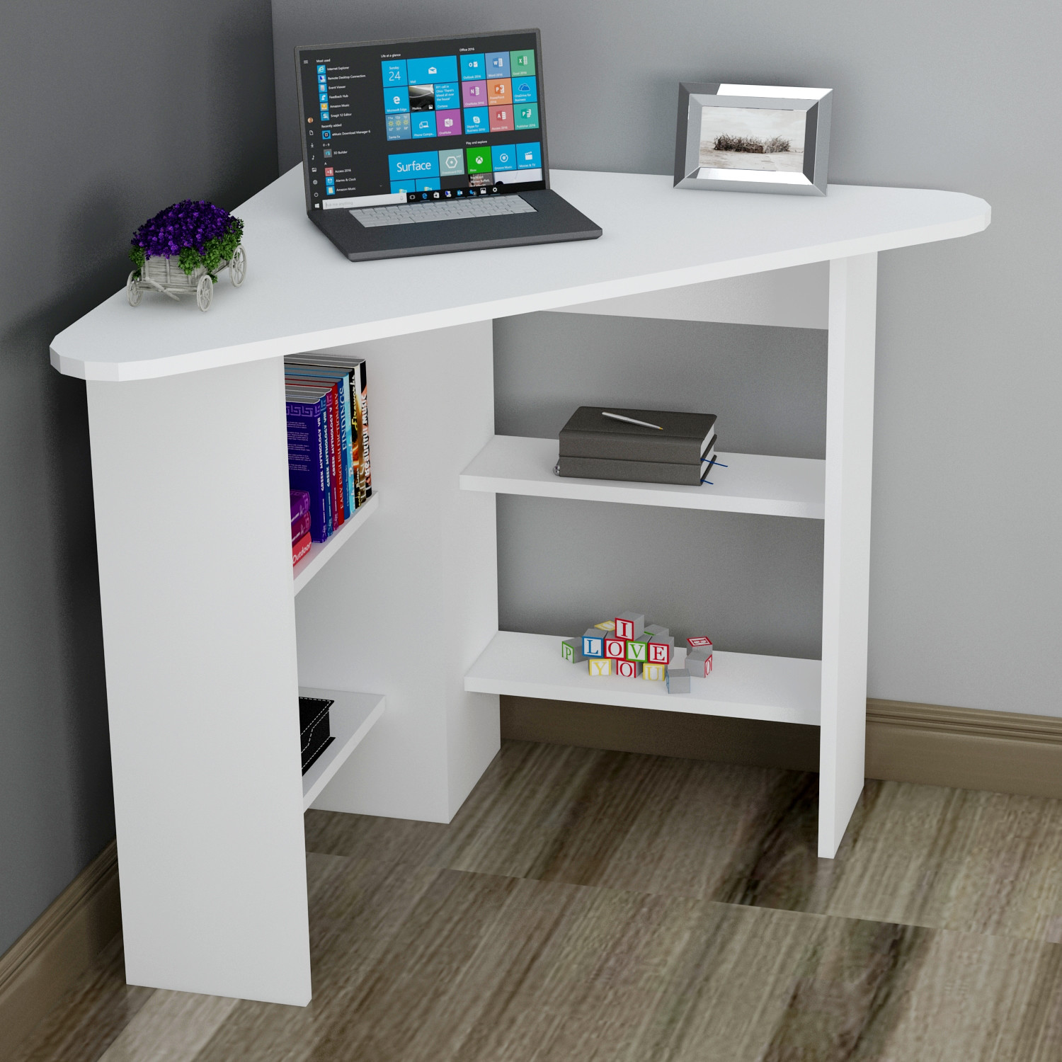 Biely, jednoduchý rohový písací stôl CORNER si zamilujete v menšom byte alebo detskej izbe, kde vám ušetrí veľa miesta.