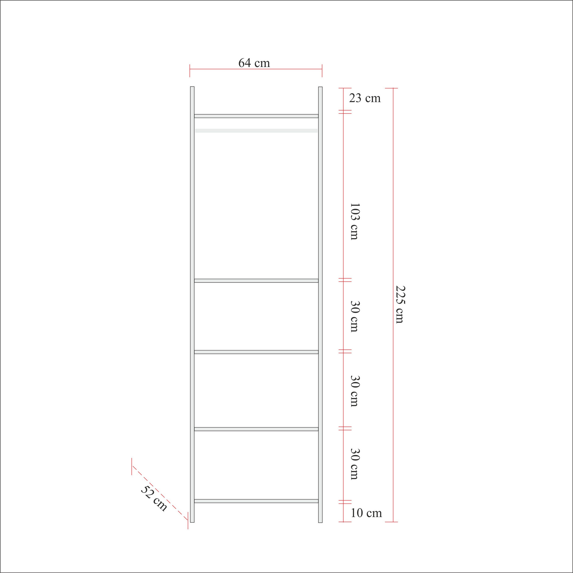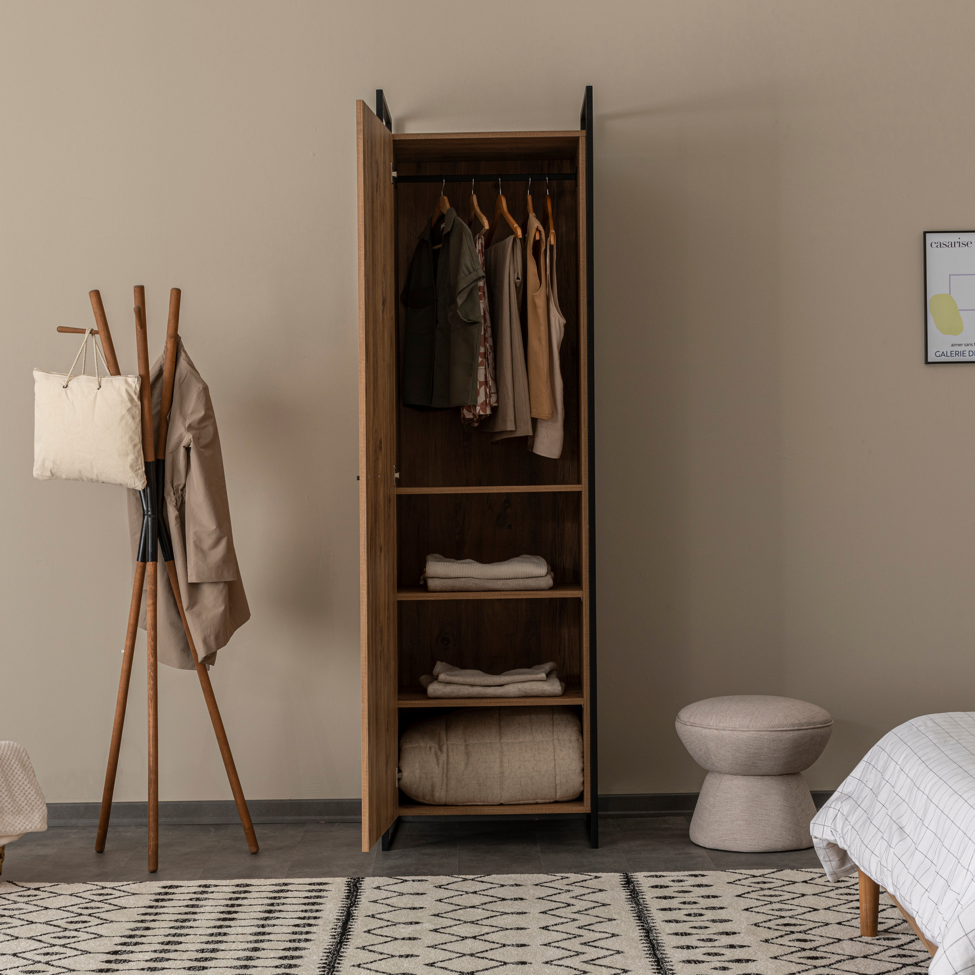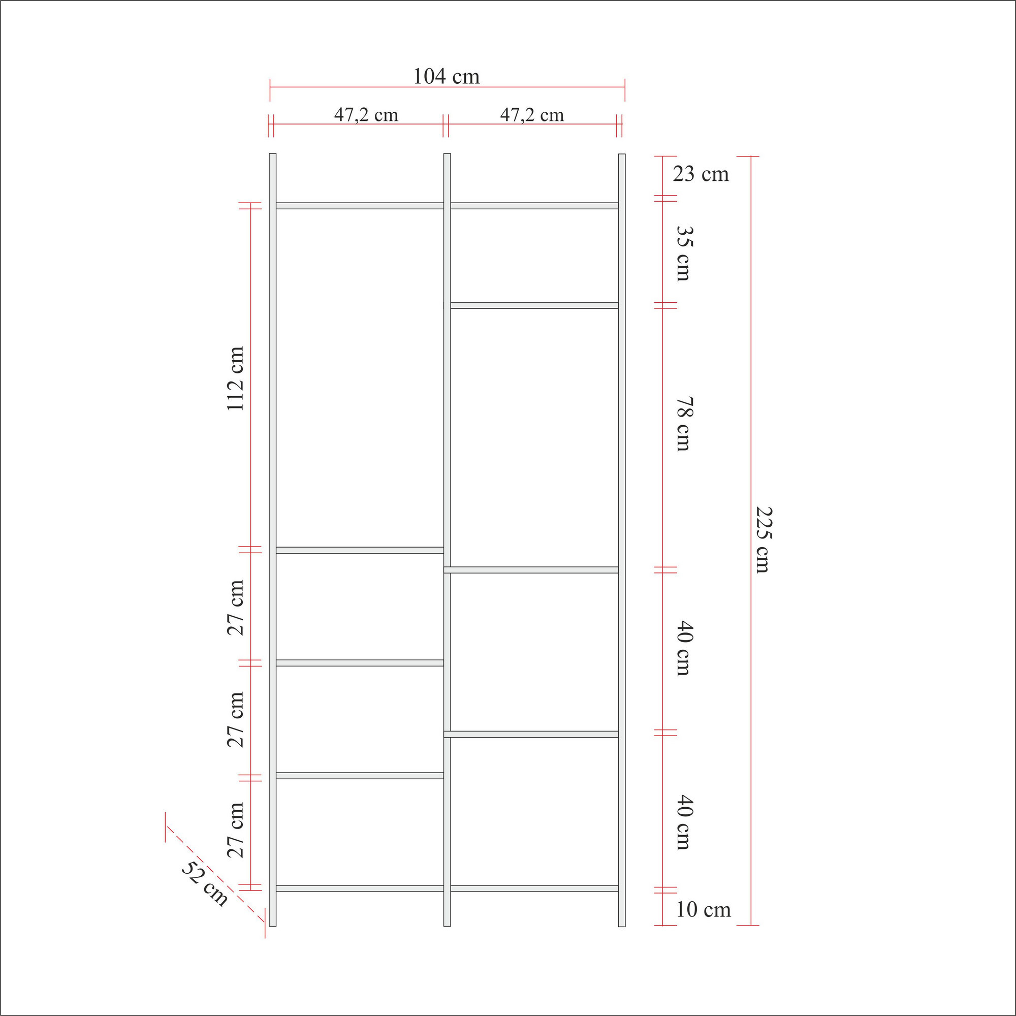 Dvojdielna priestranná šatníková skriňa s mnohými policami vo vnútri na uloženie odevov. V pravej aj ľavej časti skrine sú tyče, ktoré slúžia na zavesenie nohavíc alebo kabátov.