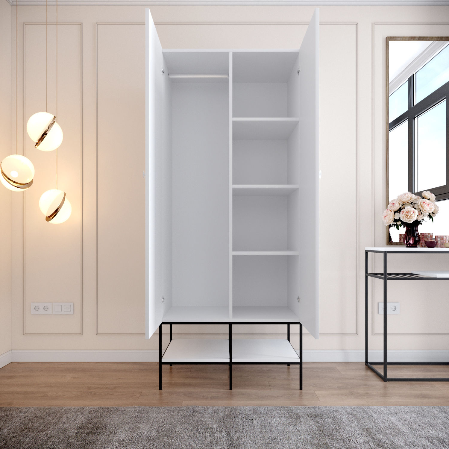 Vnútri skrine nájdeme tyč na kabáty a police na kabelky aj topánky. Pod skriňou sú ešte otvorené police na obuv alebo dekorácie.