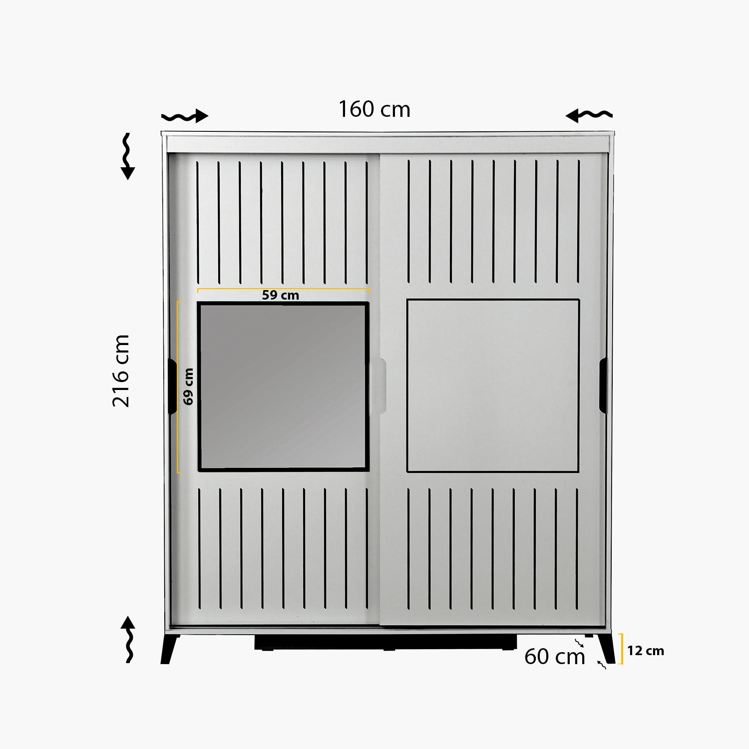 Vďaka veľkorysým rozmerom 160 cm na šírku, 216 cm na výšku a 60 cm do hĺbky ponúka táto šatníková skriňa dostatok priestoru na prehľadné usporiadanie vášho oblečenia, doplnkov a iných predmetov. Početné police poskytujú praktické možnosti ukladania, aby boli vaše veci usporiadané a ľahko dostupné.