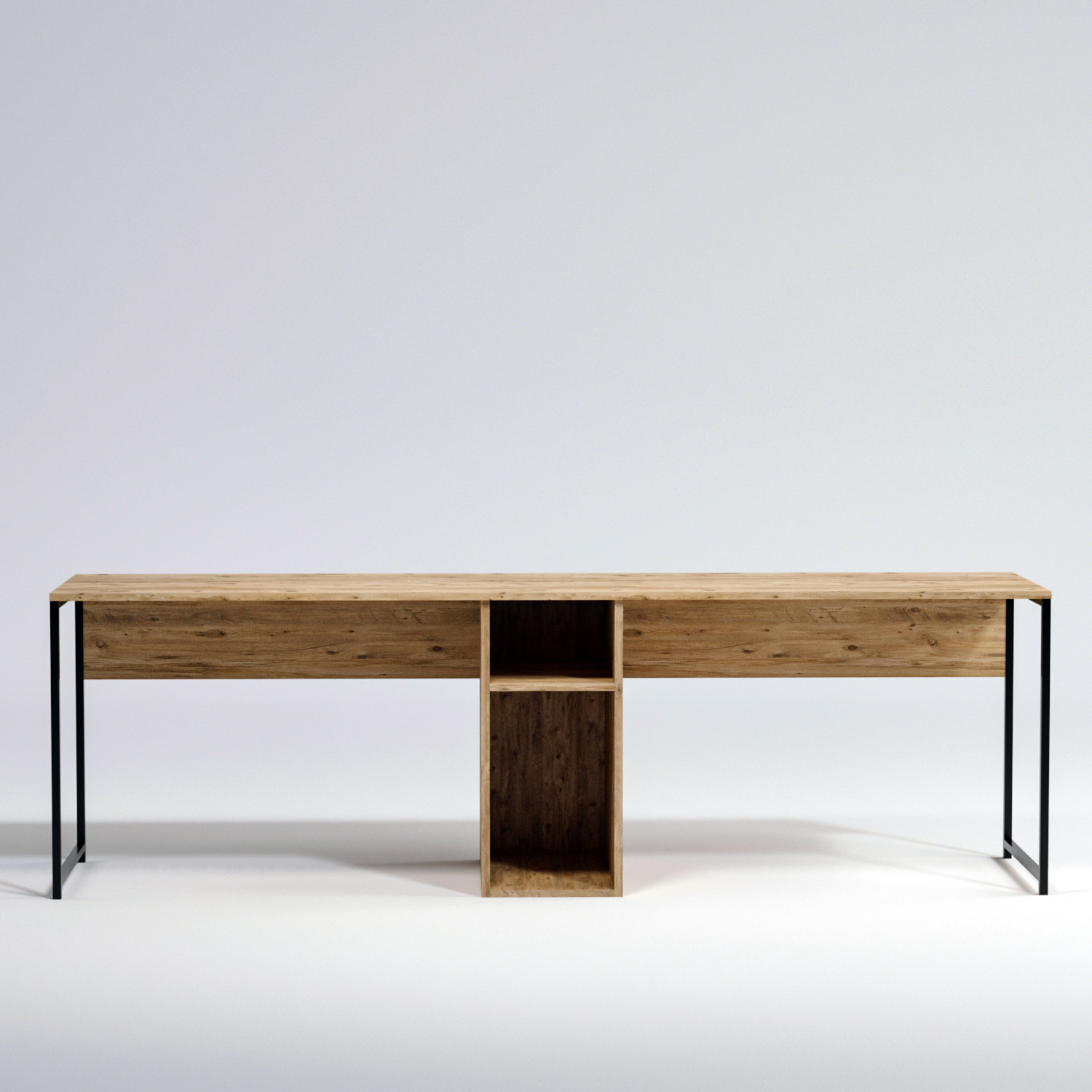 Tento písací stôl má dve pracovné plochy, ktoré uprostred spája police.