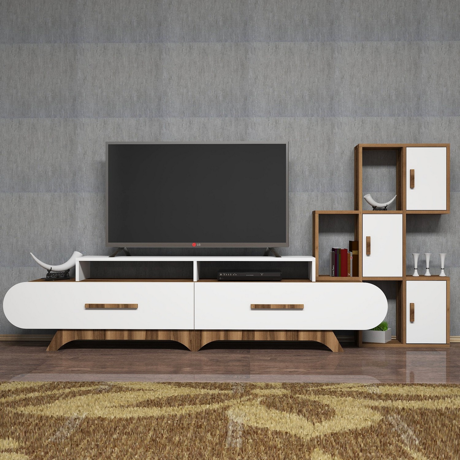 Pod TV je jedna otvorená polica na uloženie DVD zariadení, či hernej konzoly a ďalšie dve otváracie skrinky s drevenými úchytmi, ktoré vám umožnia uložiť potrebné káble, ovládače, DVD atď.