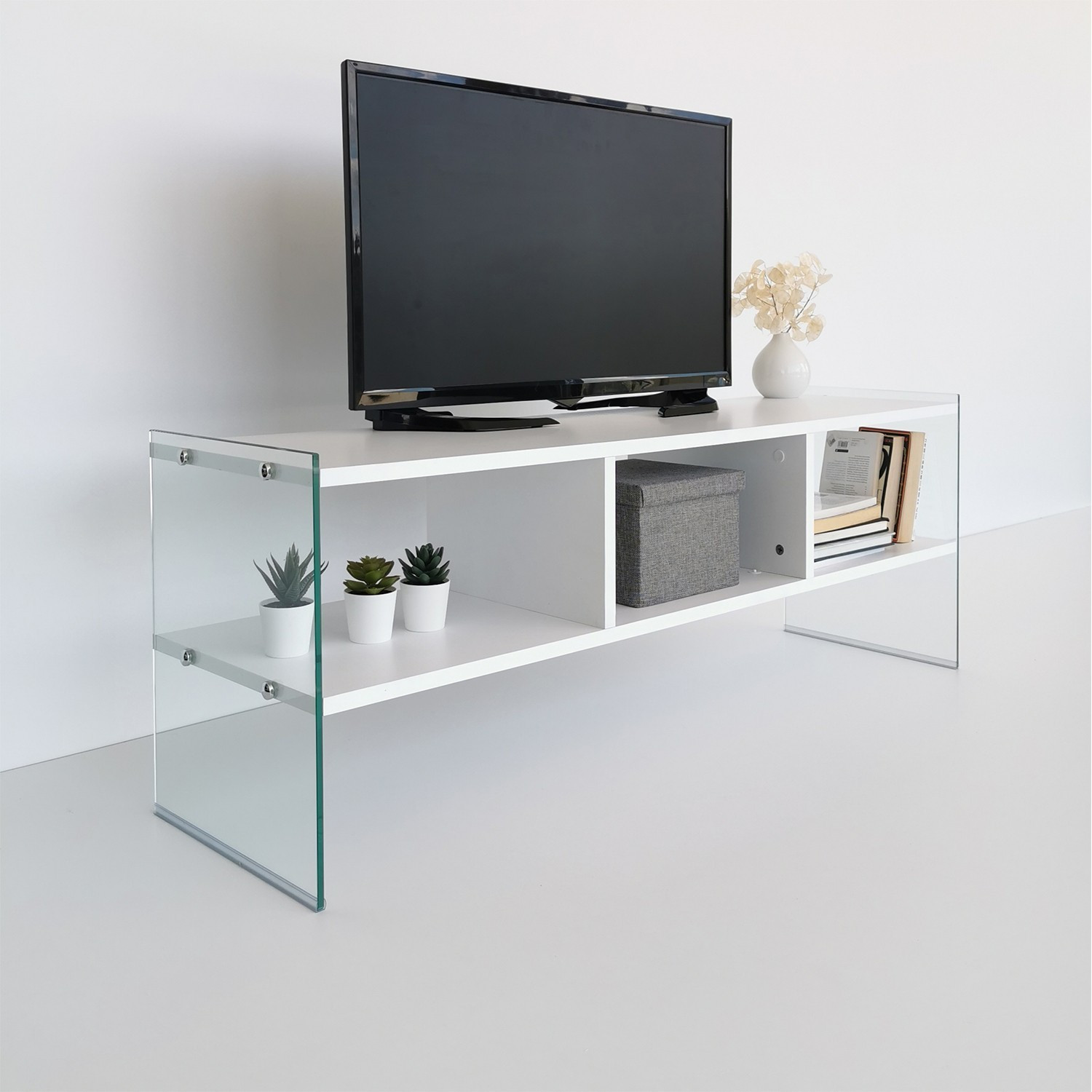 Biely televízny stolík TV400 má biele drevené telo, ktoré nesú dve sklenené bočnice, čo vyzerá pomerne krehko, prekvapí však nosnosť až 20 kilogramov.