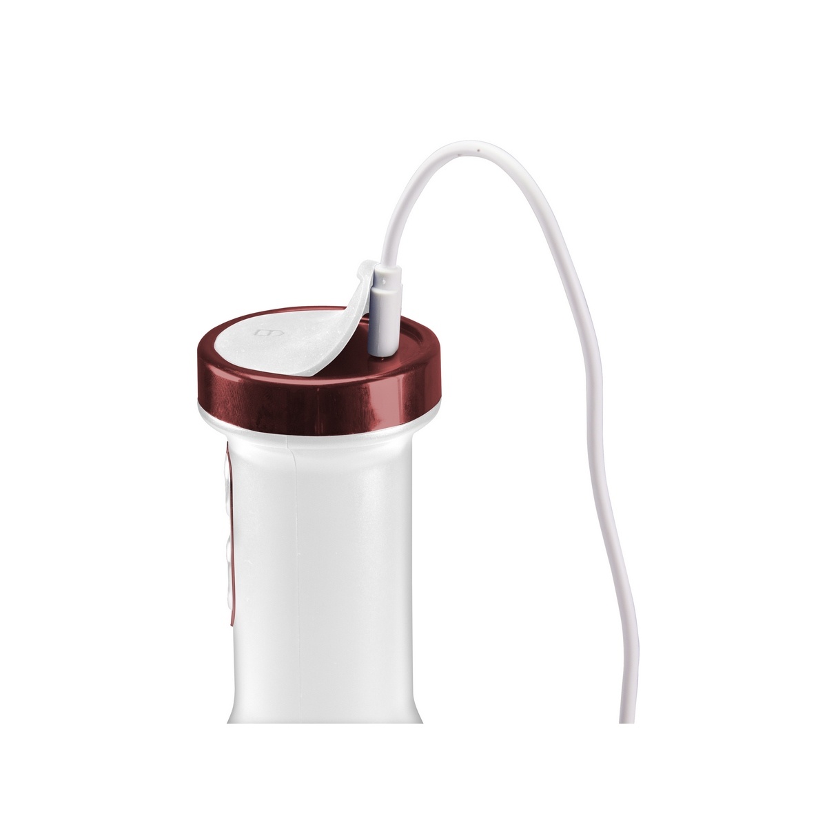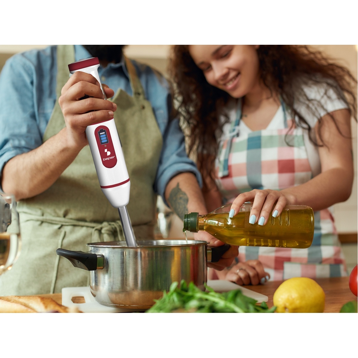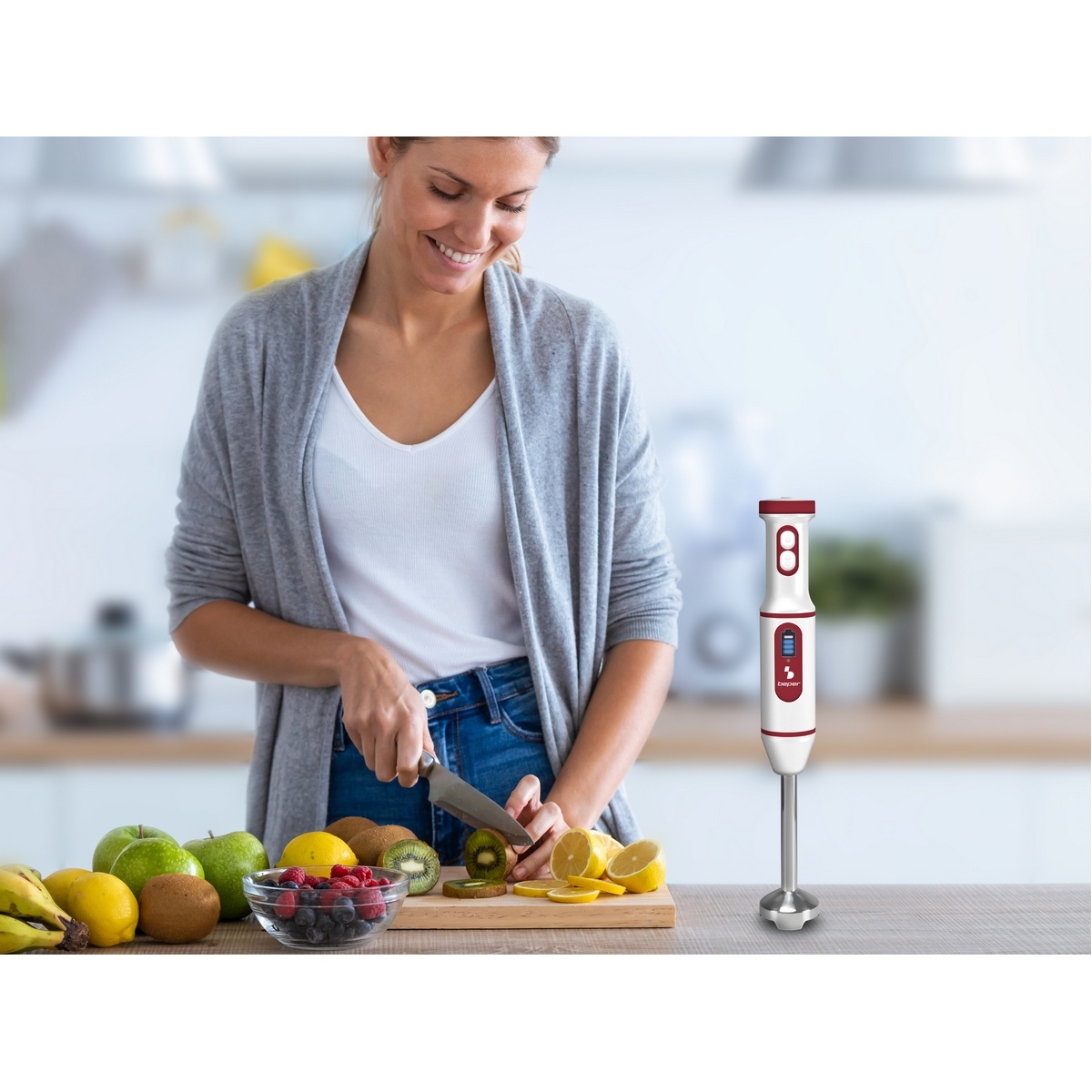 Tento praktický nabíjací ponorný mixér v elegantnom bielo-červenom prevedení je ideálnym pomocníkom pre rýchle a efektívne mixovanie a sekanie potravín. Vďaka bezdrôtovej prevádzke zaisťuje maximálnu voľnosť pohybu pri príprave pokrmov. Mixér ponúka dve rýchlosti pre precíznu kontrolu nad výsledkom mixovania.Je vybavený odnímateľnou nehrdz. mixovacou nohou a dvoma ostrými nehrdz. nožmi s ochranou proti rozstrekovaniu. Ergonomicky tvarovaná rukoväť zaisťuje pohodlné a bezpečné uchopenie, zatiaľ čo bezpečnostný systém zabraňuje nechcenému spusteniu.Lítiová batéria poskytuje až 30 minút prevádzky na jedno nabitie a stav batérie je možné ľahko sledovať na LED displeji. Nabíjanie prebieha pohodlne pomocou USB kábla (súčasť balenia) a automatické vypnutie po 30 sekundách používania zvyšuje bezpečnosť a úsporu energie. Mixér je ľahko čistiteľný, čo z neho robí praktický a efektívny doplnok do každej kuchyne.