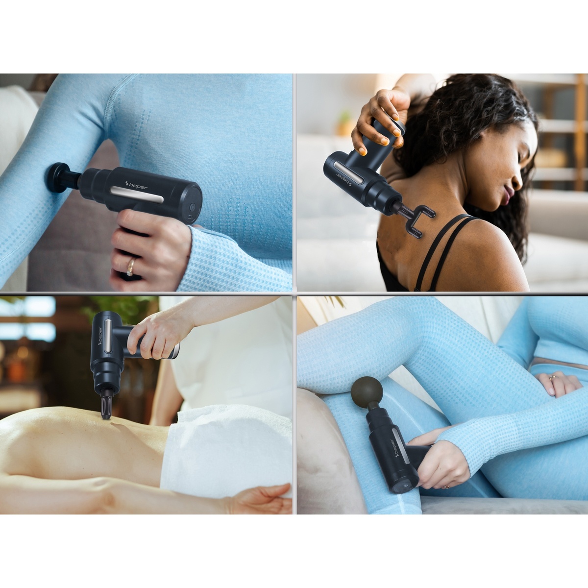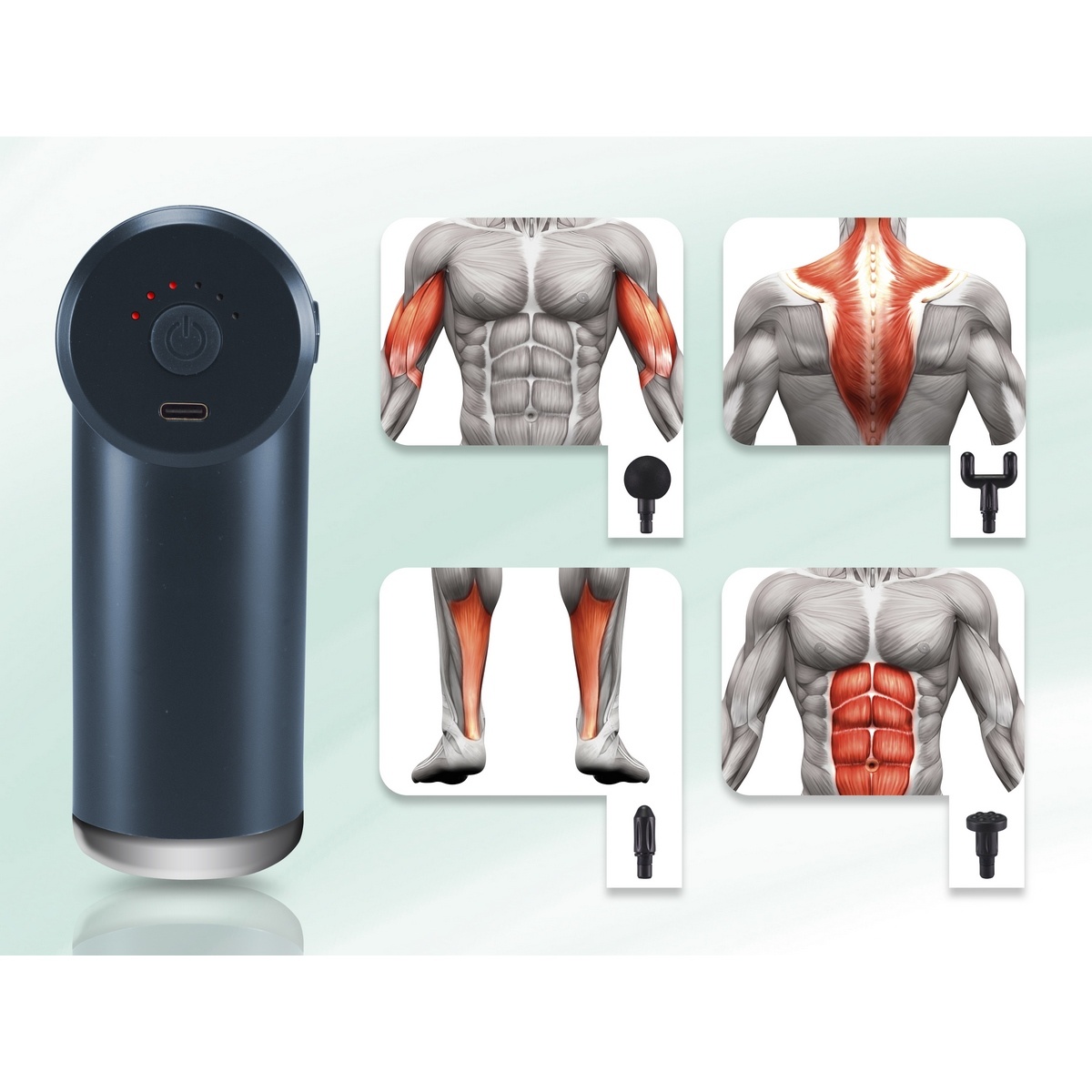 Táto kompaktná a výkonná masážna pištoľ je ideálnym riešením na uvoľnenie a regeneráciu svalov po náročnom cvičení alebo dlhom dni. Pomáha zmierniť svalové napätie, stuhnutosť a znižuje tvorbu kyseliny mliečnej, čo prispieva k rýchlejšej regenerácii tela. Vďaka až 3 700 opakovaniam za minútu dosiahnete hlboké svalové skupiny a stimulujete krvný obeh.Pištoľ ponúka 6 úrovní nastavenia intenzity a je vybavená 4 vymeniteľnými nadstavcami pre rôzne druhy masáží: